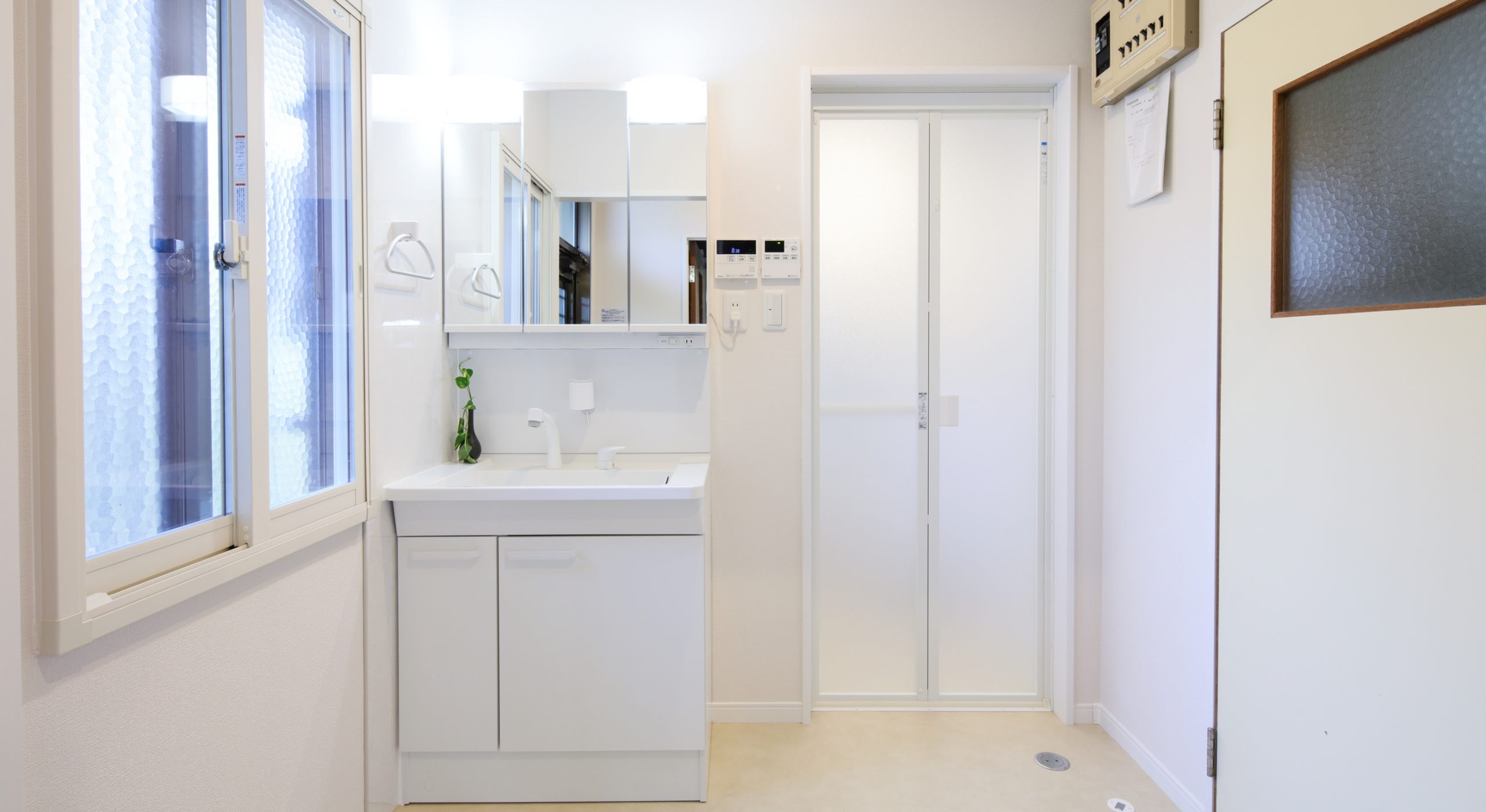 洗面化粧台取替え、扉取替え、クロス貼替え、床張替え