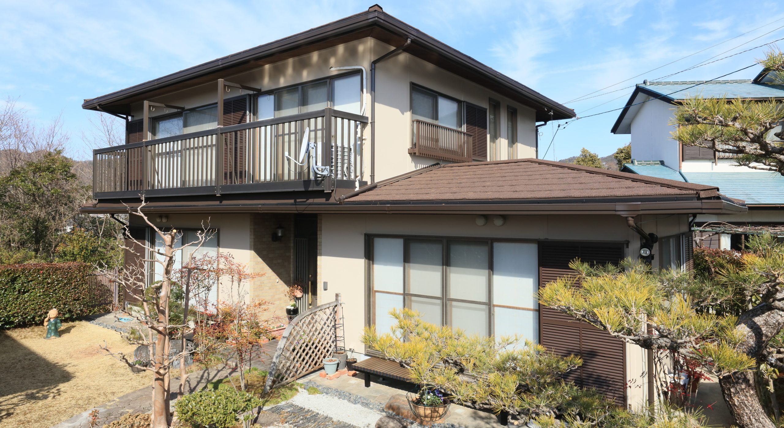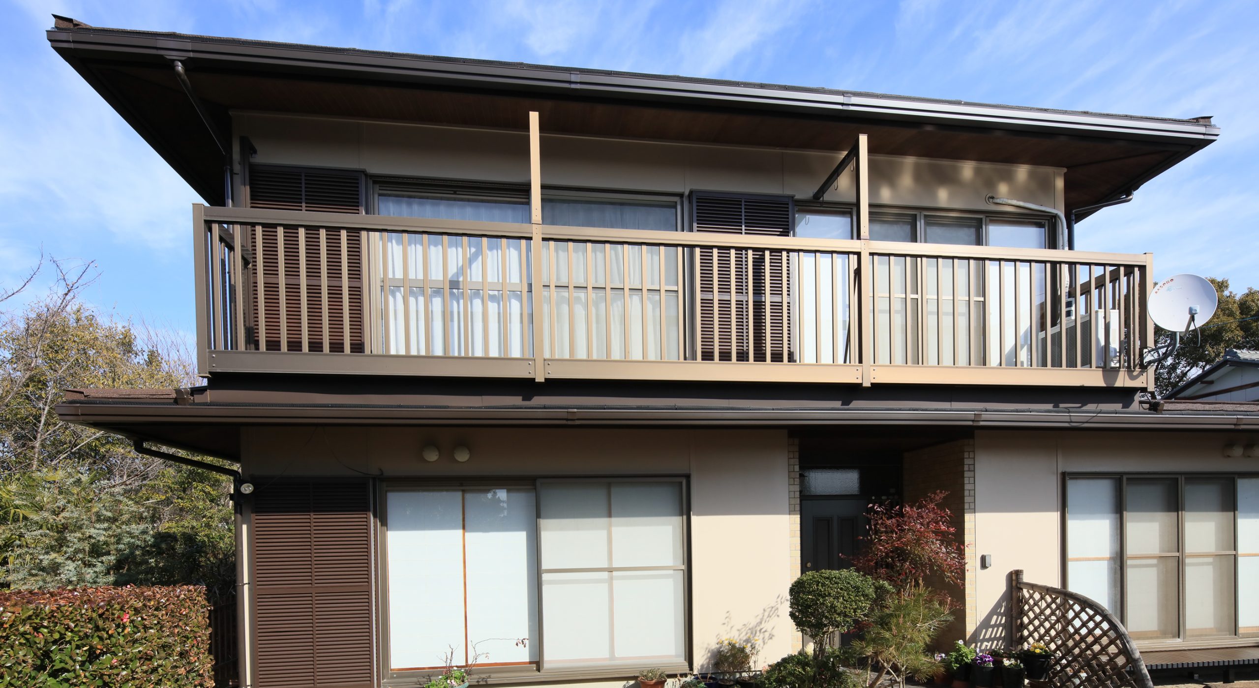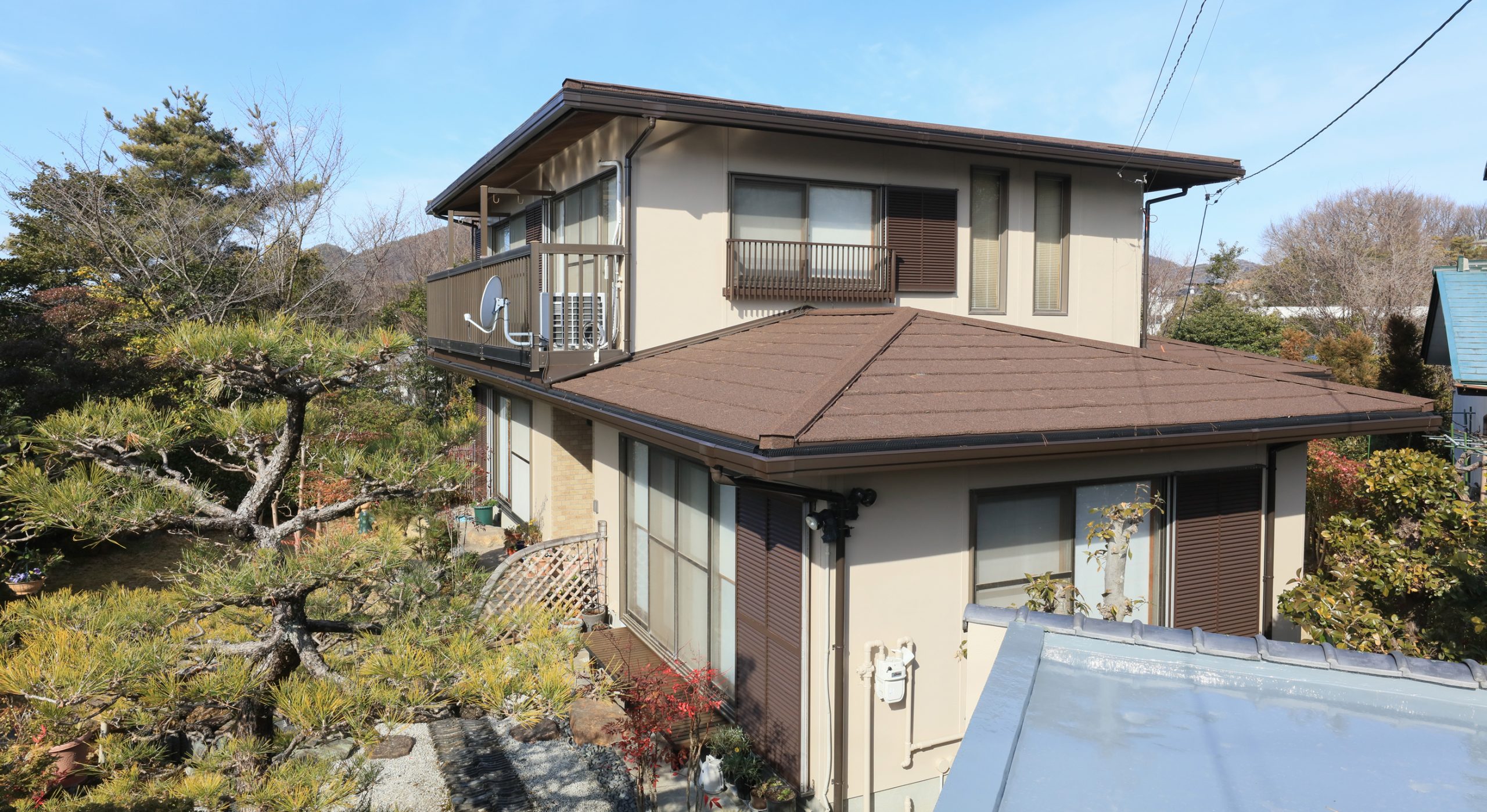 外壁は、家の雰囲気に合わせて落ち着いた印象の色味に塗装させていただき、新しい屋根と雨戸の色合いとも調和した仕上がりとなりました。