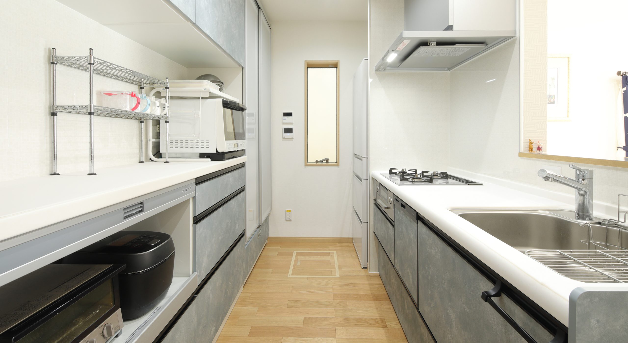 そこで、廊下をなくしてLDKに取り込む「間取りの変更」をご提案させていただきました。キッチンが広くなり家電収納スペースを十分に確保するだけでなく、LDK全体がすっきりと明るい空間に仕上がりました。