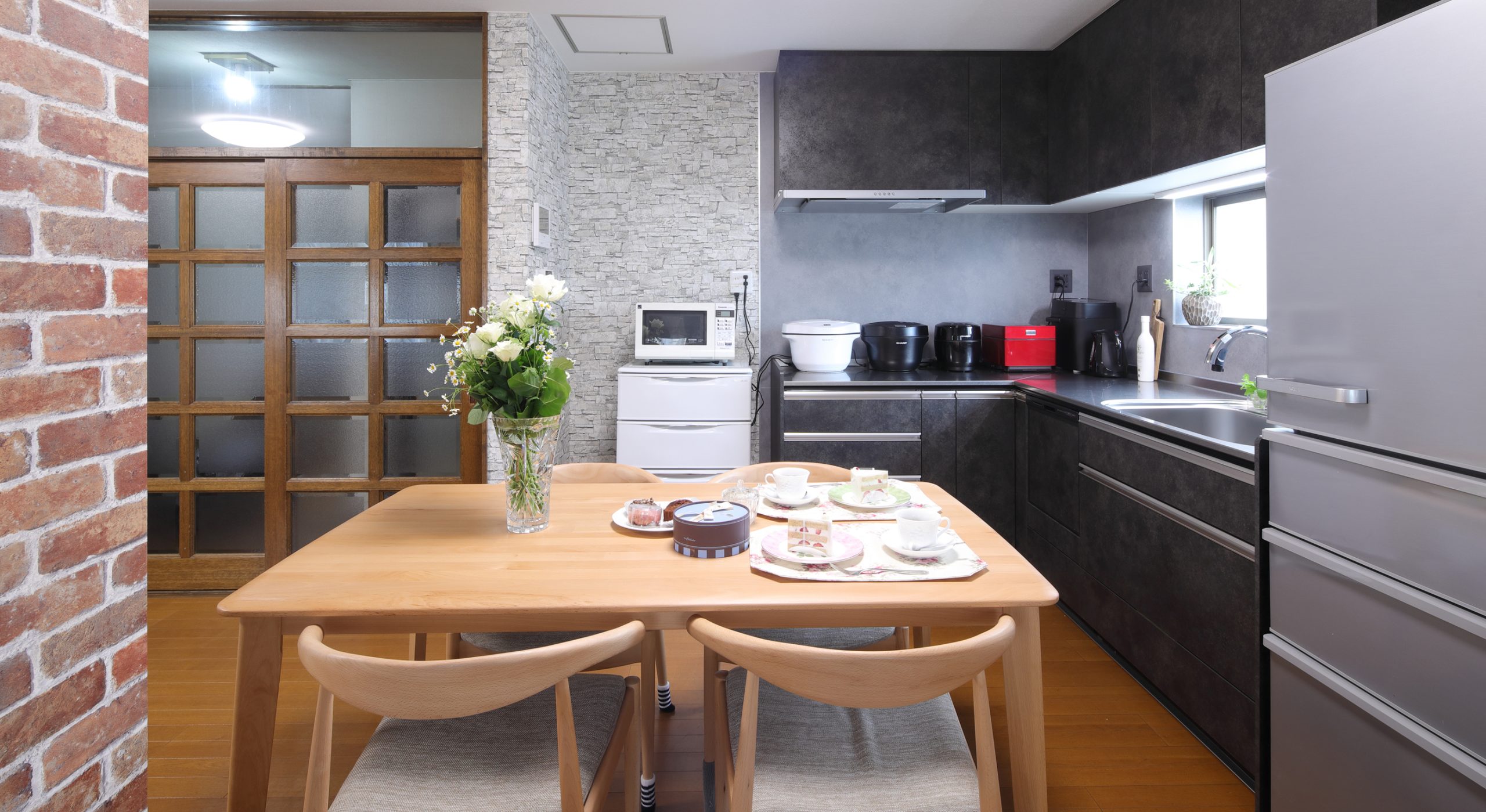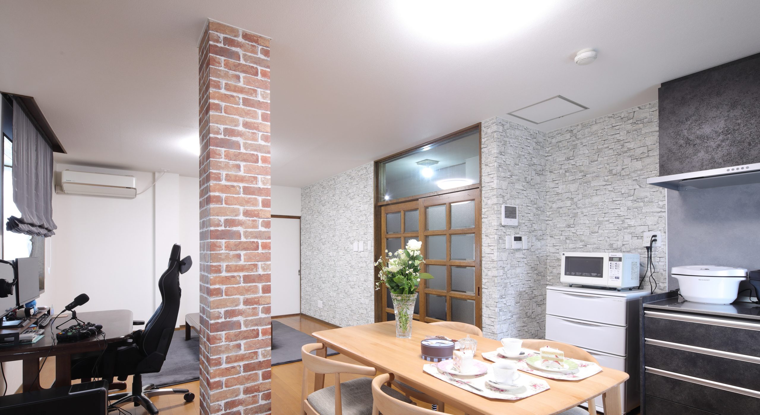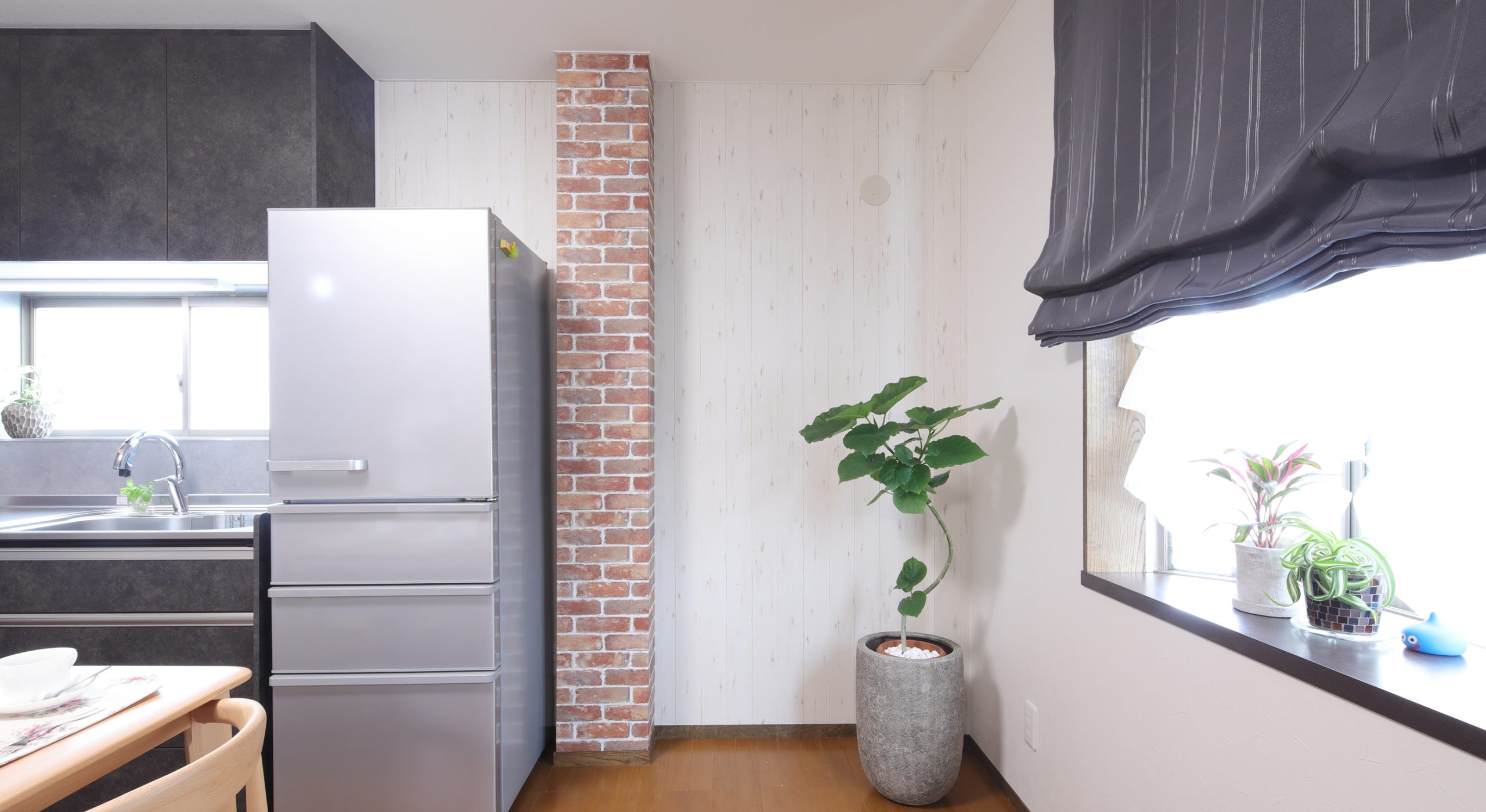間取りは変更していませんが、壁面と柱にアクセントクロスを貼ることで、リビングとダイニングの雰囲気を一新させるスタイリッシュな空間に仕上げました。