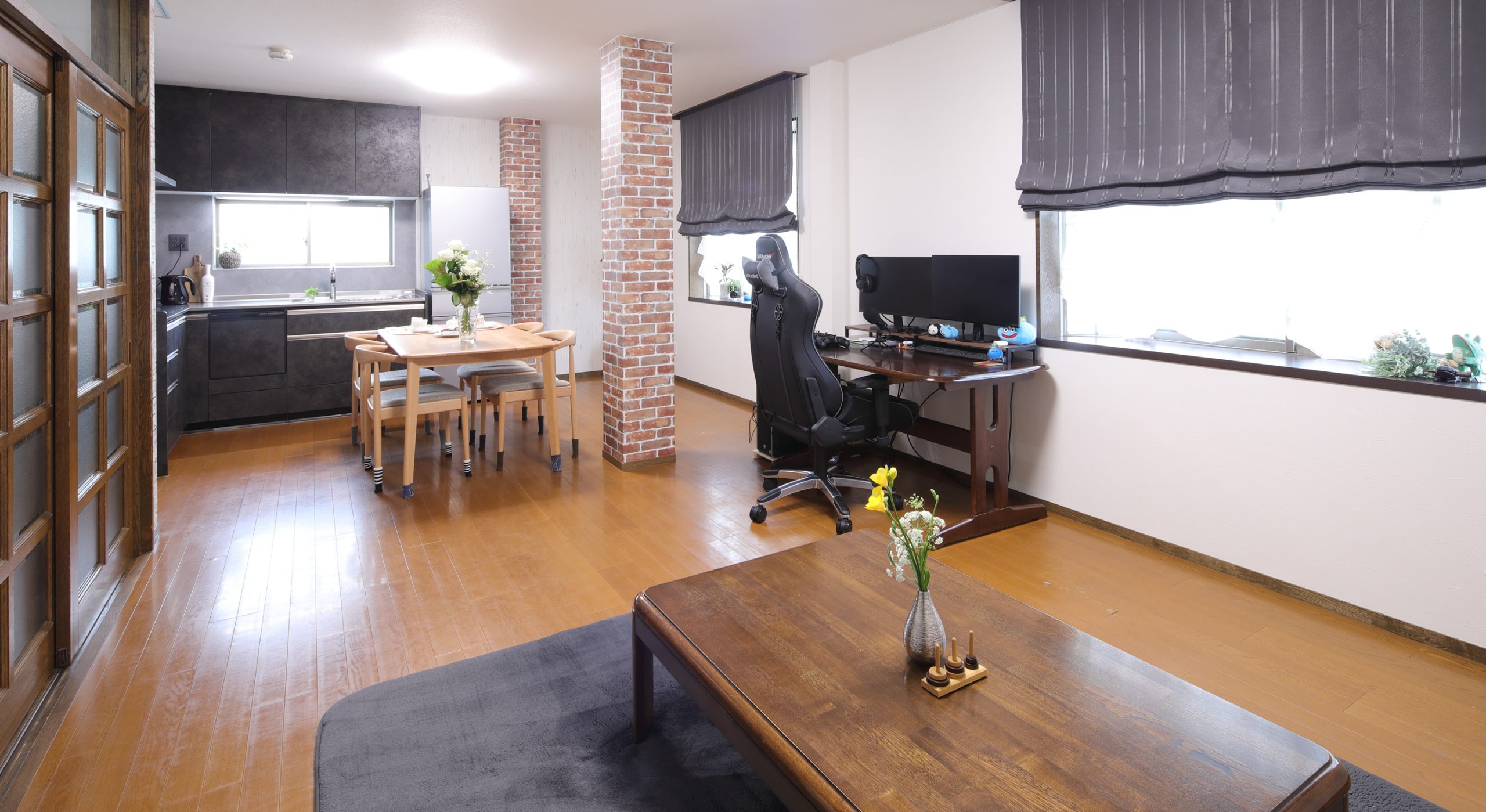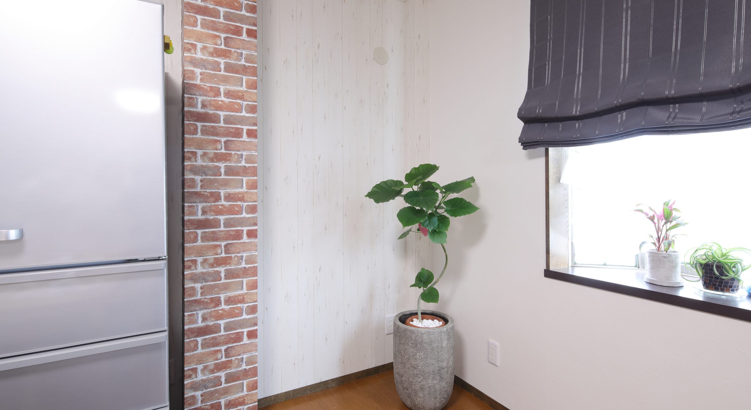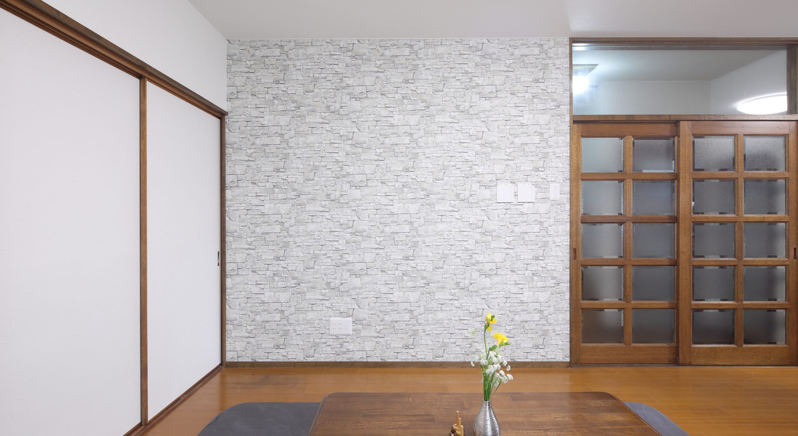 間取りは変更していませんが、壁面と柱にアクセントクロスを貼ることで、リビングとダイニングの雰囲気を一新させるスタイリッシュな空間に仕上げました。