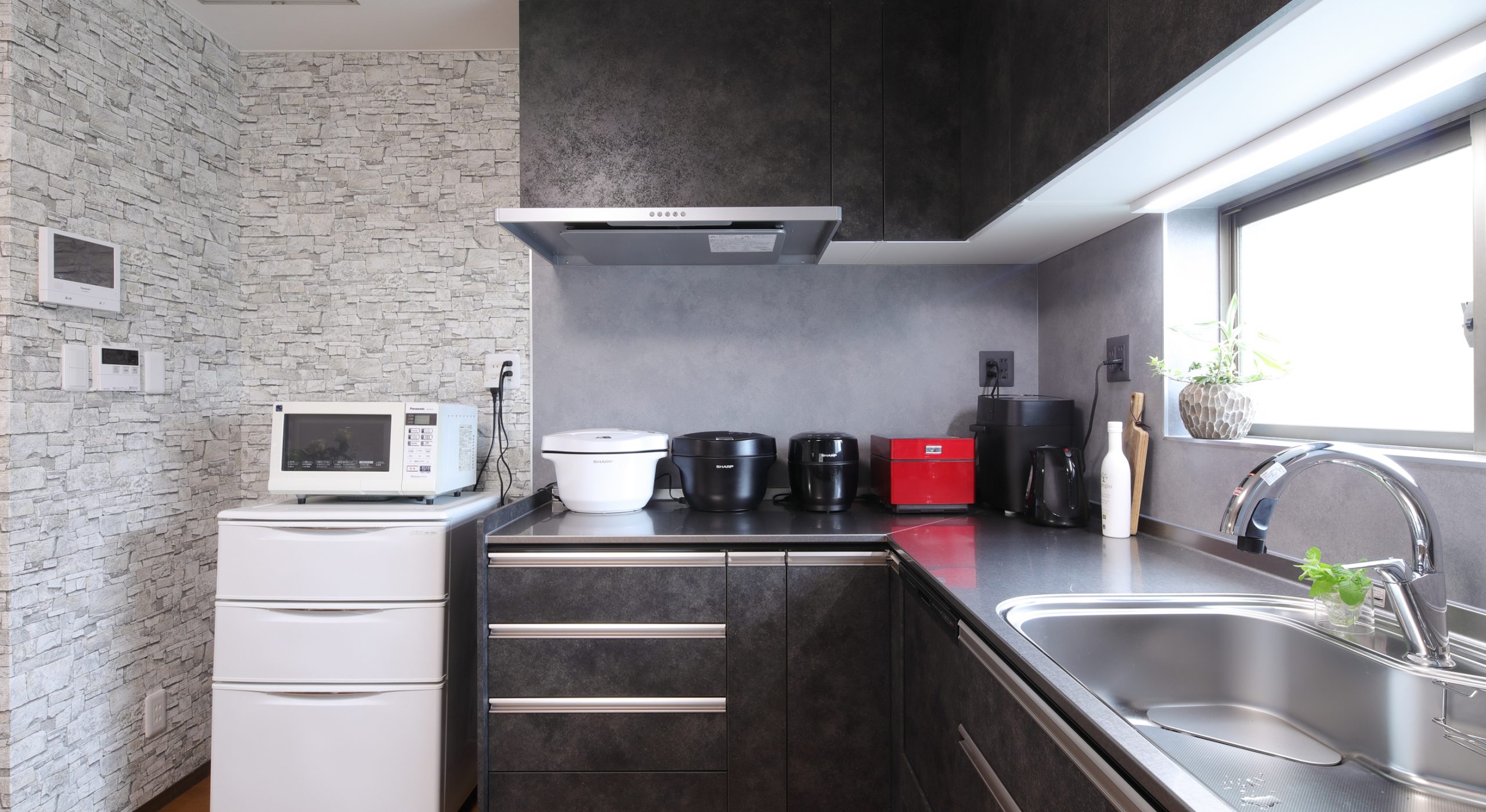 シックなブラックの面材に合わせてコンセントも同色にすることで、機能的で統一感のある洗練されたキッチンとなりました。