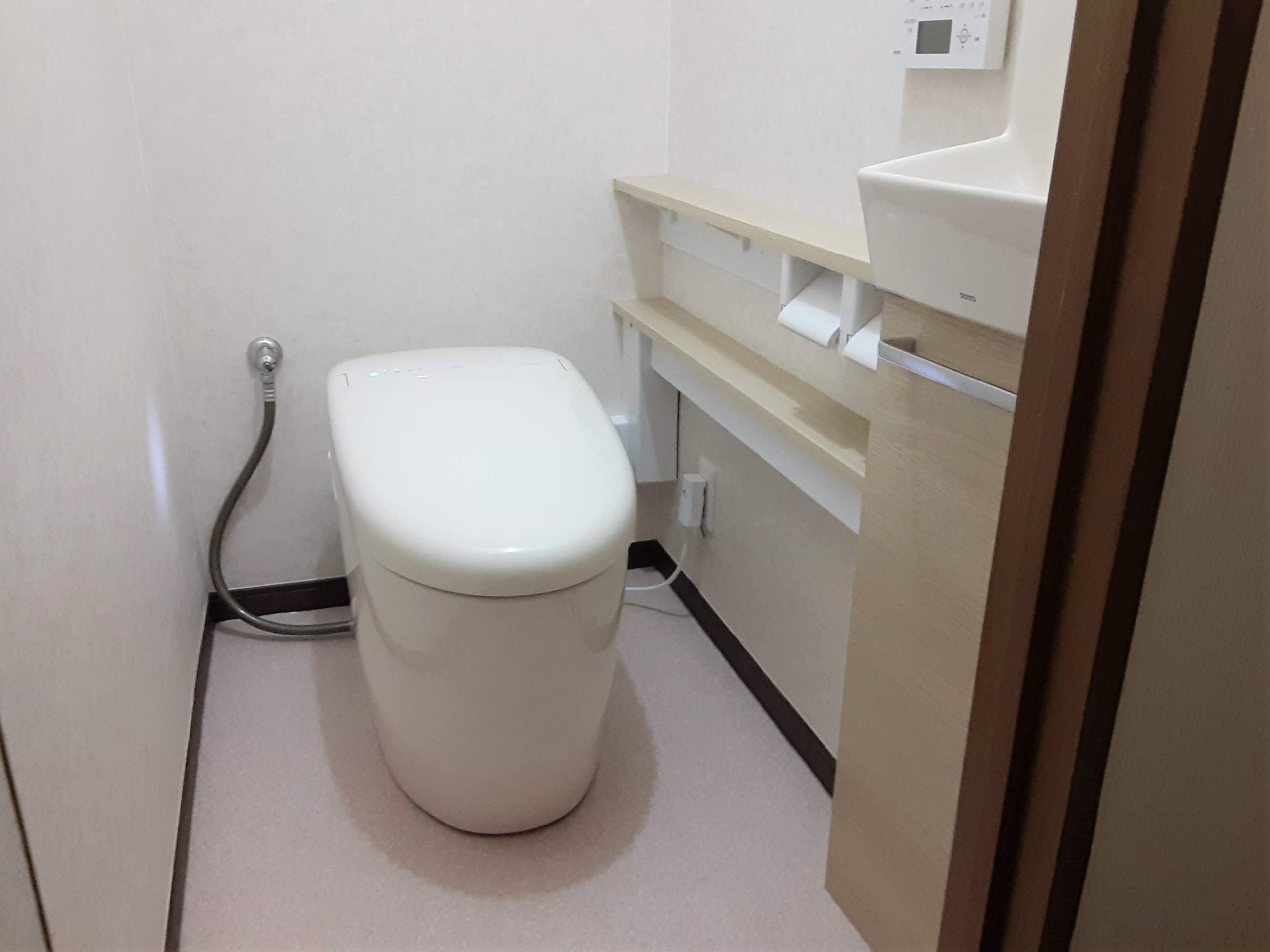 新しく設置した手洗いキャビネットに掃除用品などを収納できるようになり、見た目もすっきりとしたトイレ空間に仕上がりました。