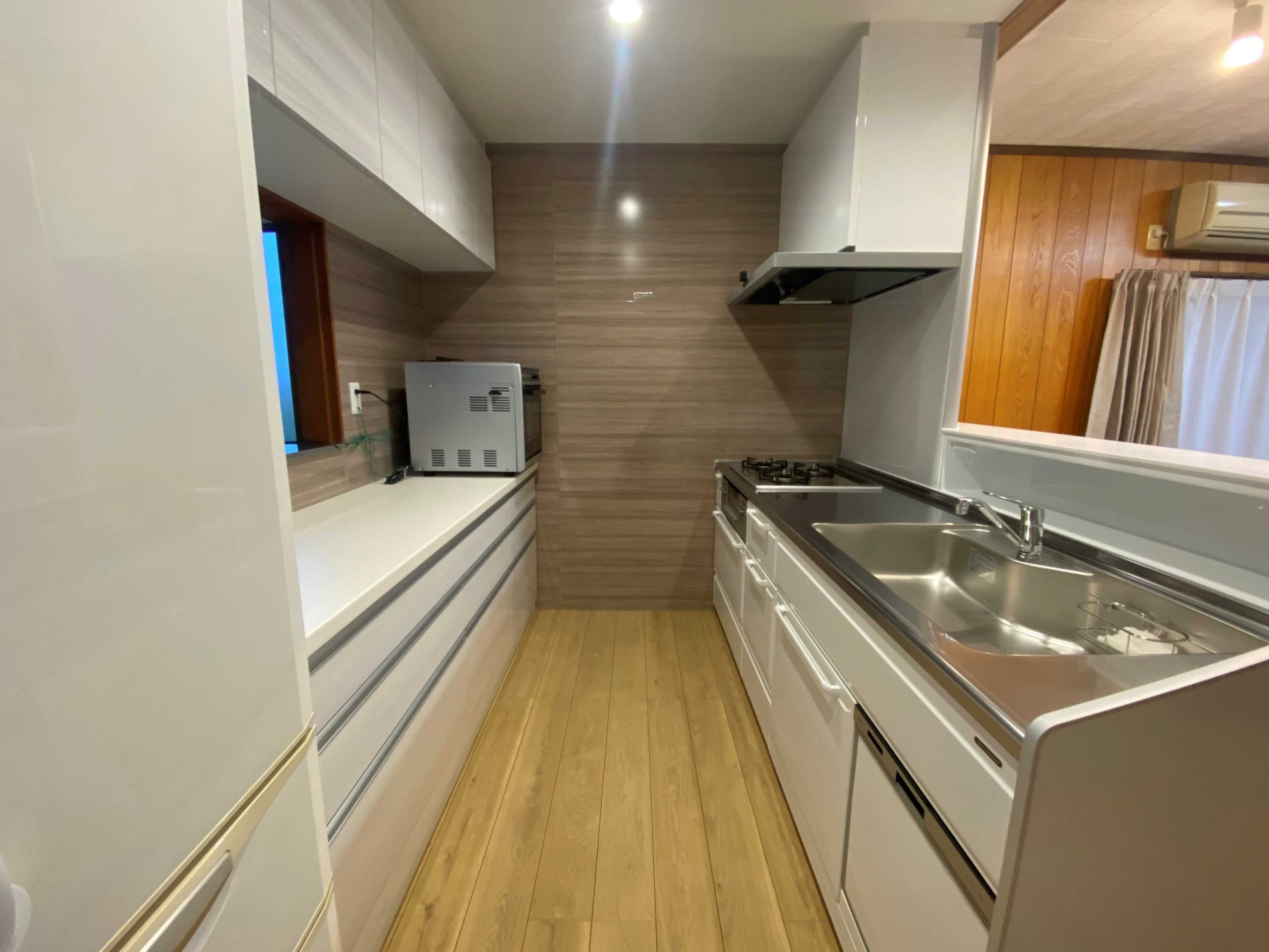 白を基調にした明るいキッチンスペースになり、ご家族で会話を楽しみながらお料理や片づけをしていただけるようになりました。