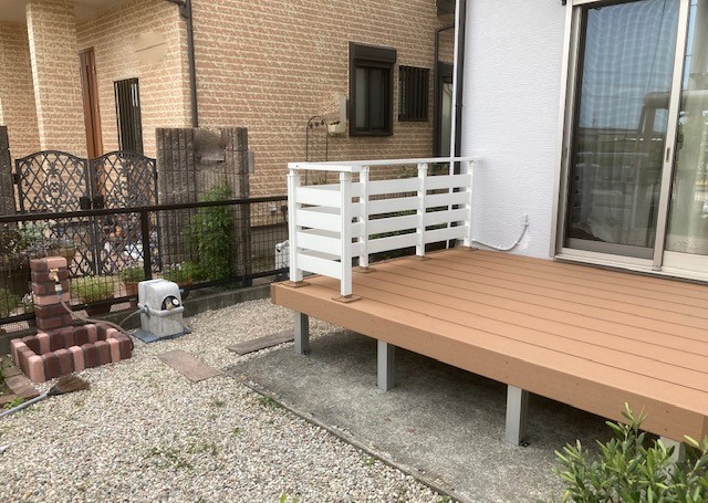 お庭のウッドデッキが狭くて老朽化も気になるとのことでした。また、夏場に床材が熱くなるため、今よりも広くて愛犬とくつろげるデッキにしたいとのご要望でした。