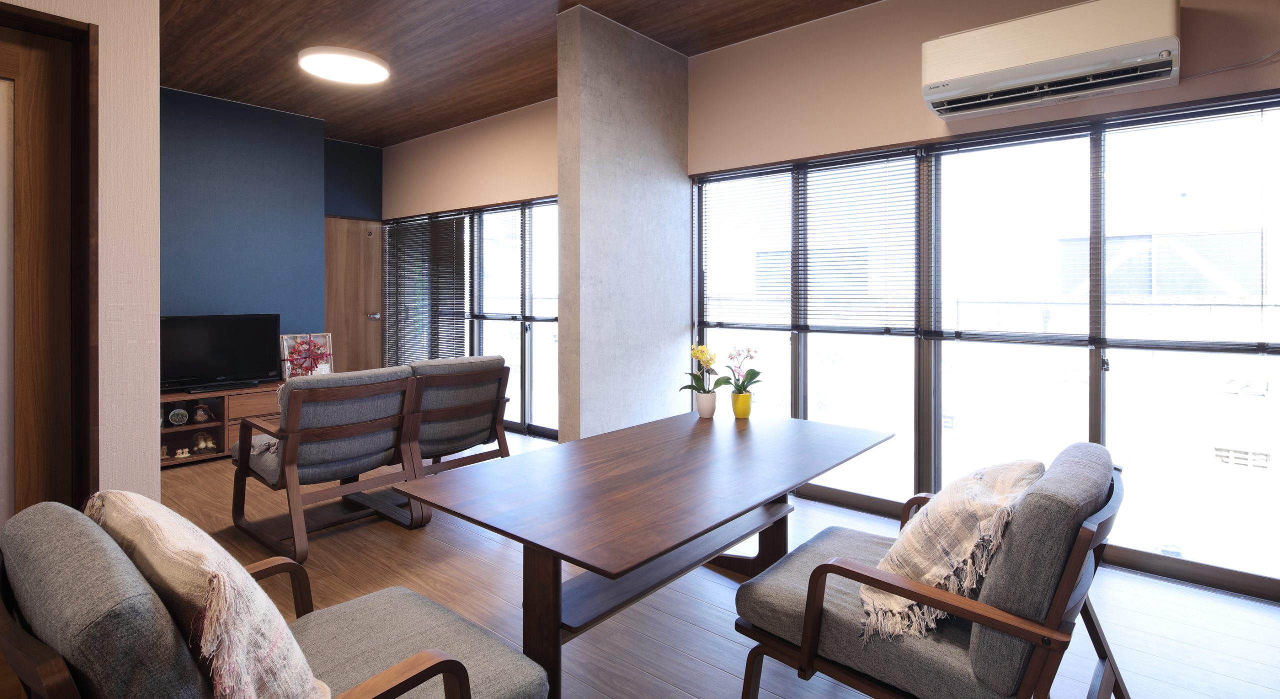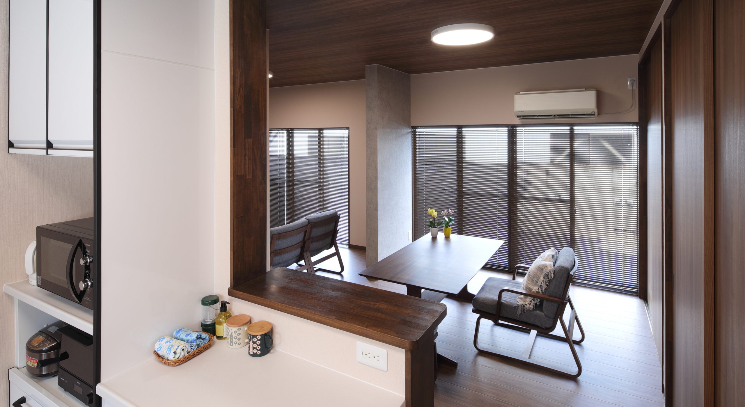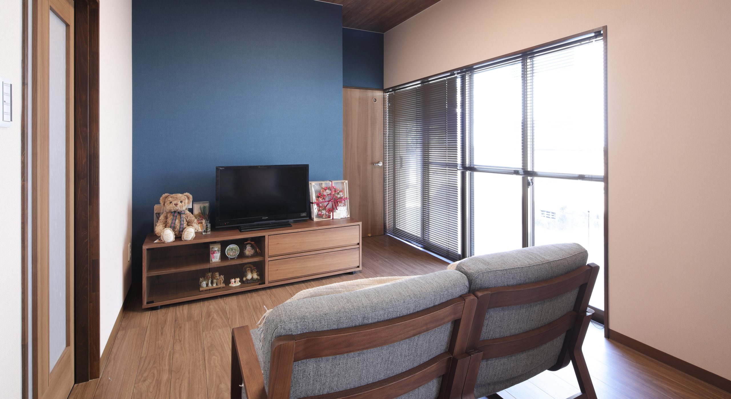 こだわりのクロスの色味に合わせて、リビングの掃き出し窓にはブラインドを選定することで、スタイリッシュで落ち着きのある空間となりました。