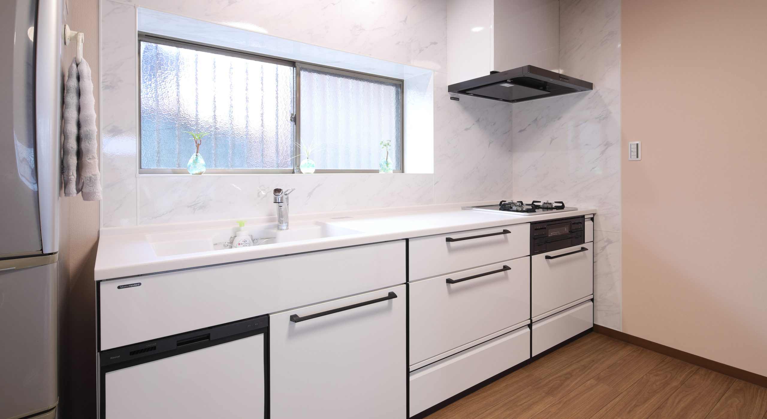 LDK間取り変更、和室を洋室に改修、システムキッチン取替え、在来浴室からシステムバスに取替え、洗面化粧台取替え、トイレ取替え、ガス温水式床暖房設置、衣類乾燥機設置、洗濯機移設、床張替え、クロス貼替え、ブラインド取付け、防蟻(ぼうぎ)処理 -