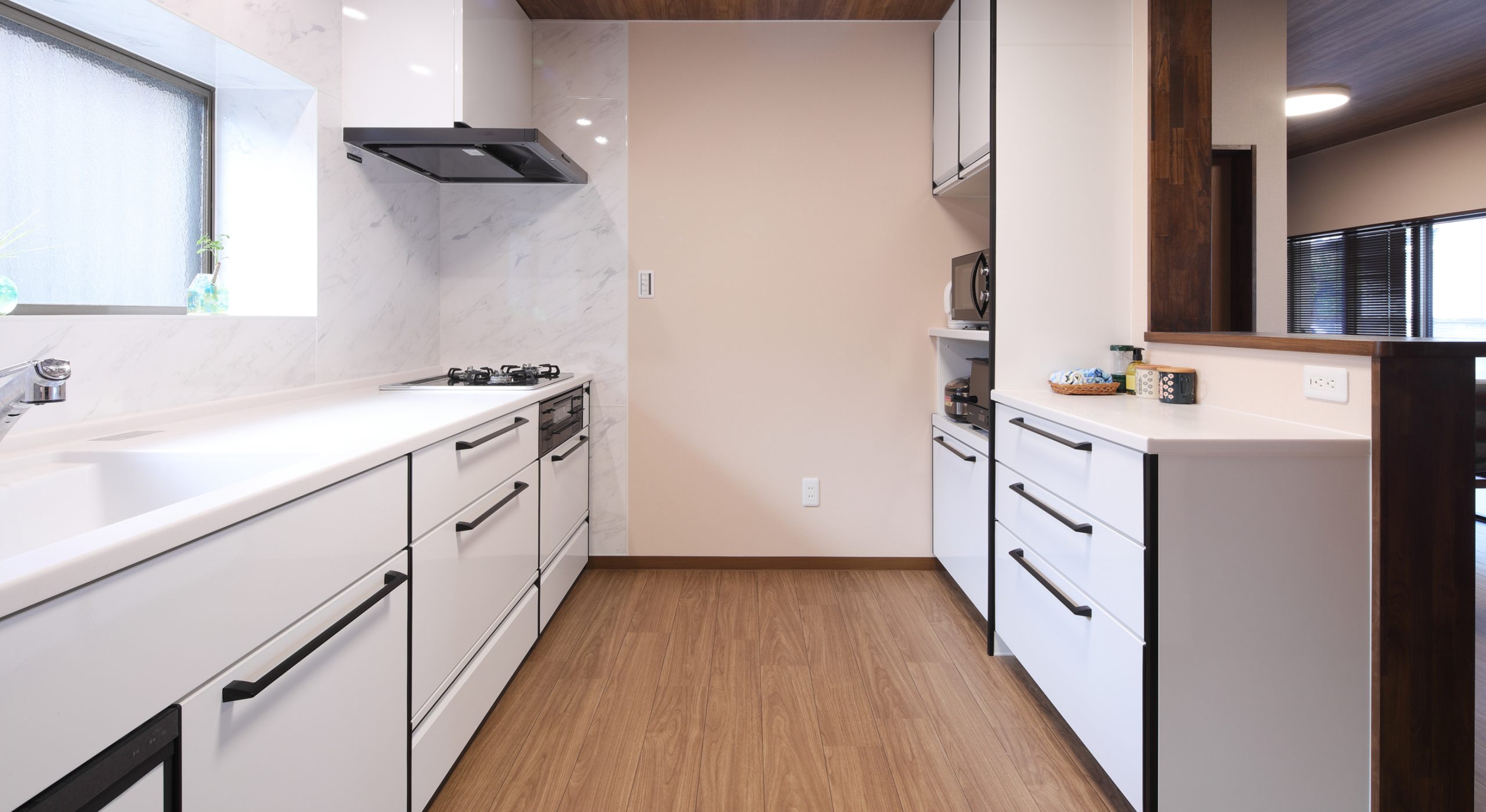 キッチンの隣りにあった和室2部屋を洋室にして、床の段差を解消することで、キッチンと繋がる広々としたLDK空間に仕上げました。