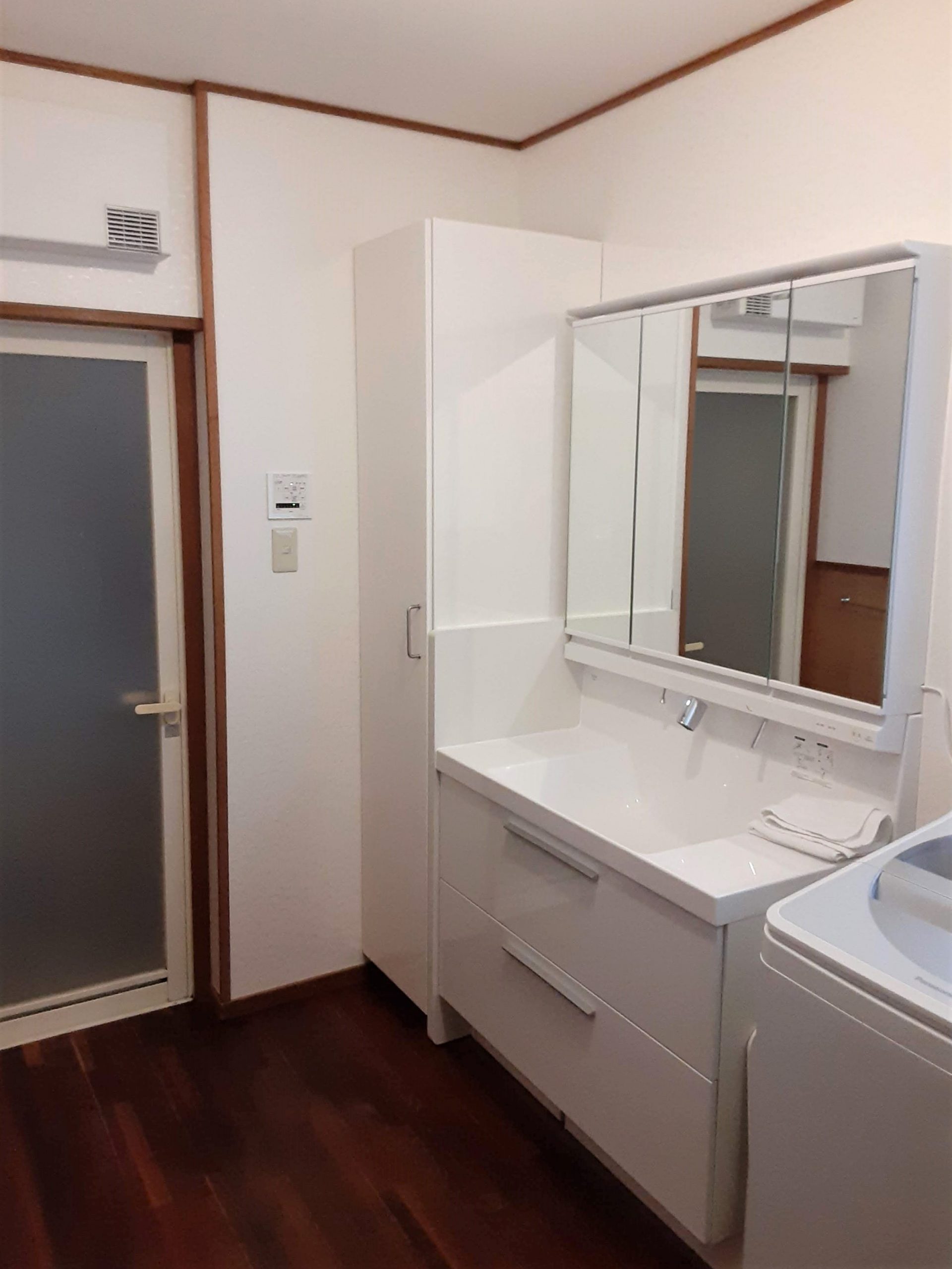 また、洗面脱衣室をより広く快適にお使いいただけるように、置き型から壁付け型の洗面所暖房機へのお取替えをご提案いたしました。暖房機能だけでなく涼風機能もあるため、洗面室の壁に取り付けられていた扇風機を取り外して、広々とした空間に生まれ変わりました。