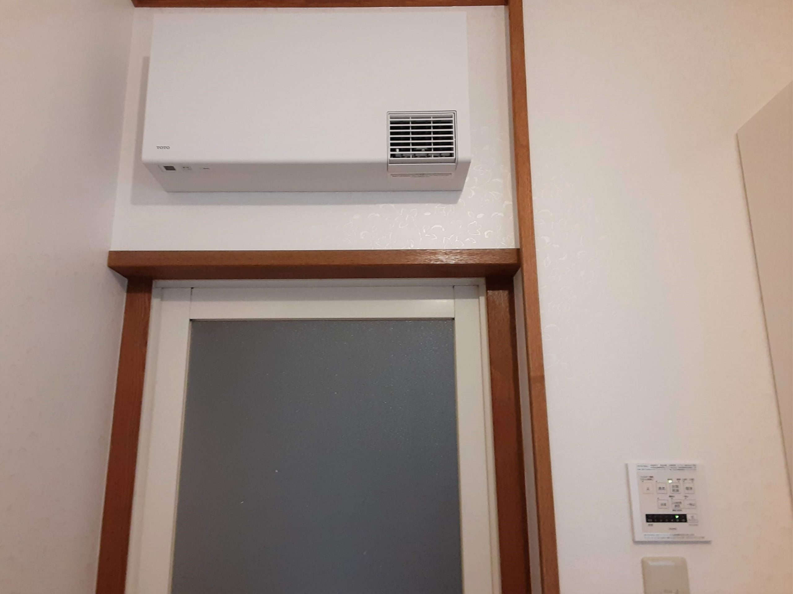 洗面所暖房機(涼風機能付き)設置、クロス貼替え