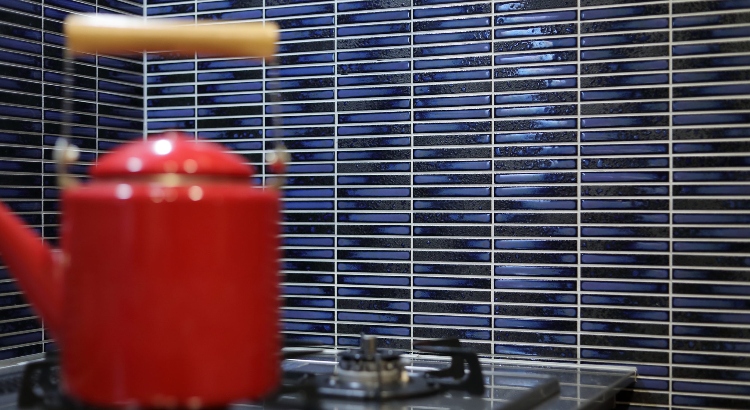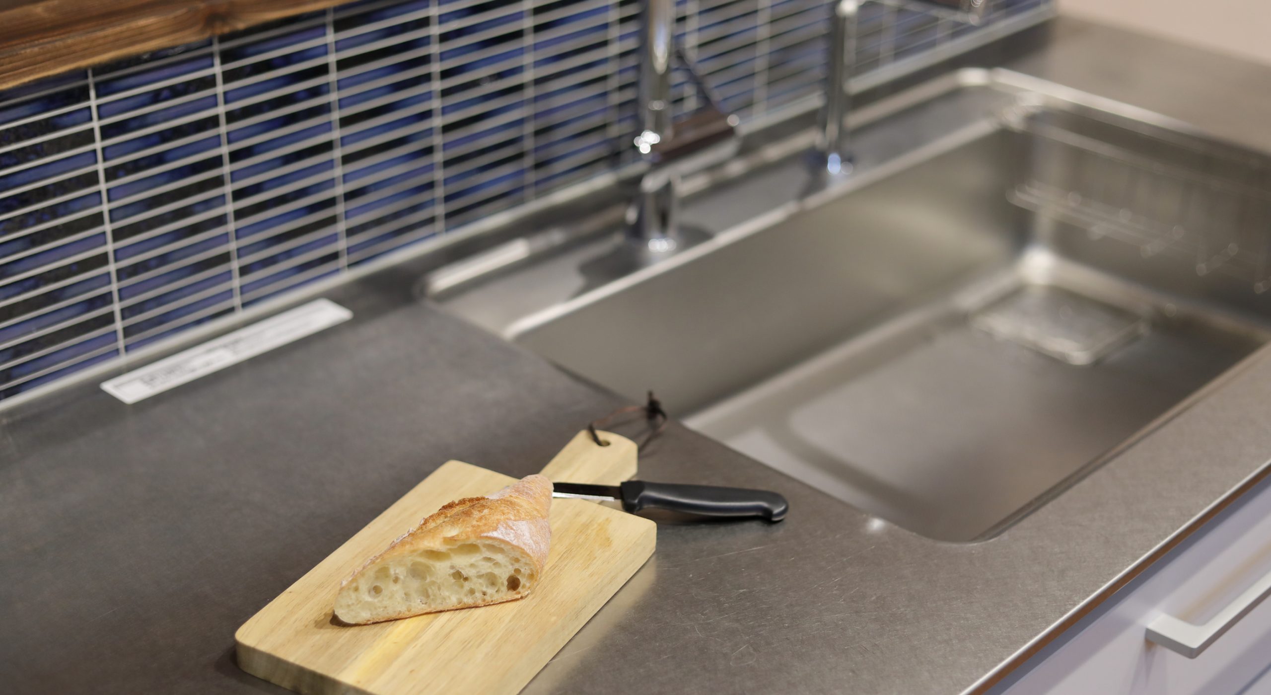 キッチンのコンロ位置は汚れの面を考慮し北西入隅部で、尚且つ対面式がご希望でしたのでクラッソの特注寸法2列式をご提案しました。キッチンの壁はタイル仕上げで落ち着いた、重厚感のあるイメ-ジに。
