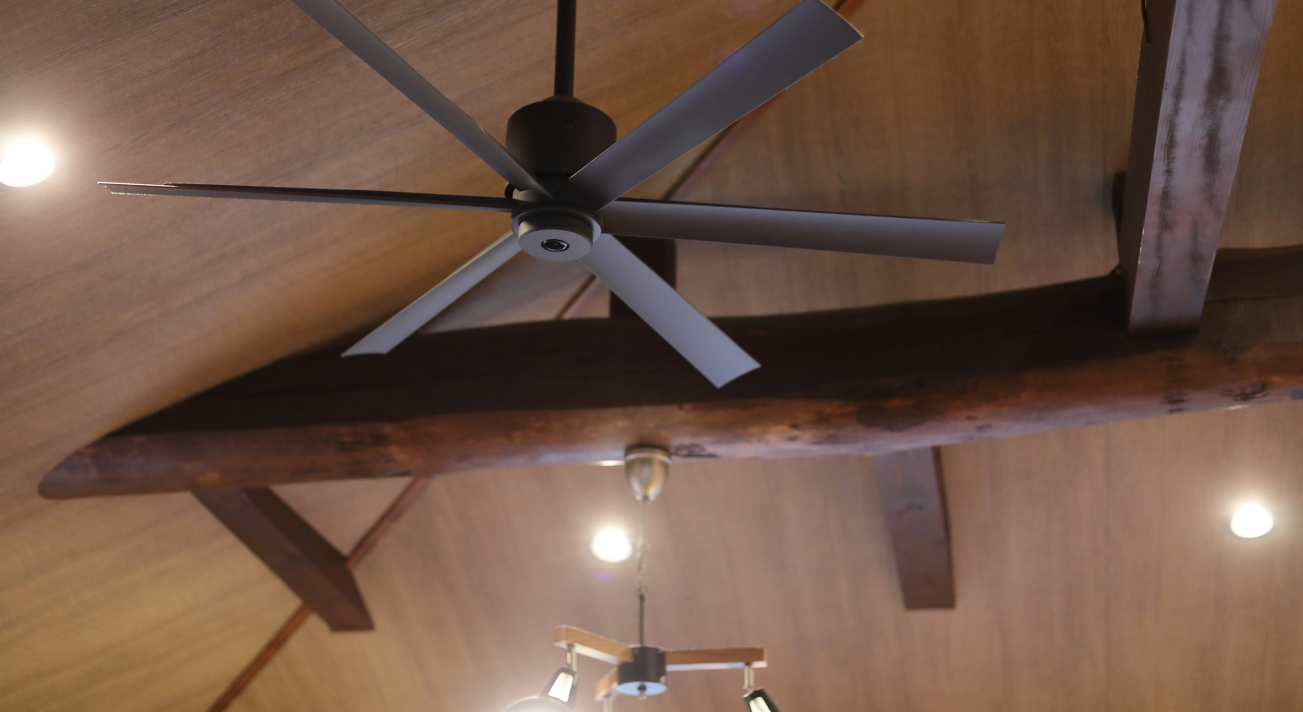 ダイニングと和室にあった壁と天井を解体し、丸太の梁を現した空間にすることにより、圧迫感を省き、空間の有効活用が可能になりました。 構造を確保するために新たに設けた垂れ壁部分には、コンクリート打ちっぱなし風のクロスで、空間デザインも意識した遊びゴコロのある空間を表現。
