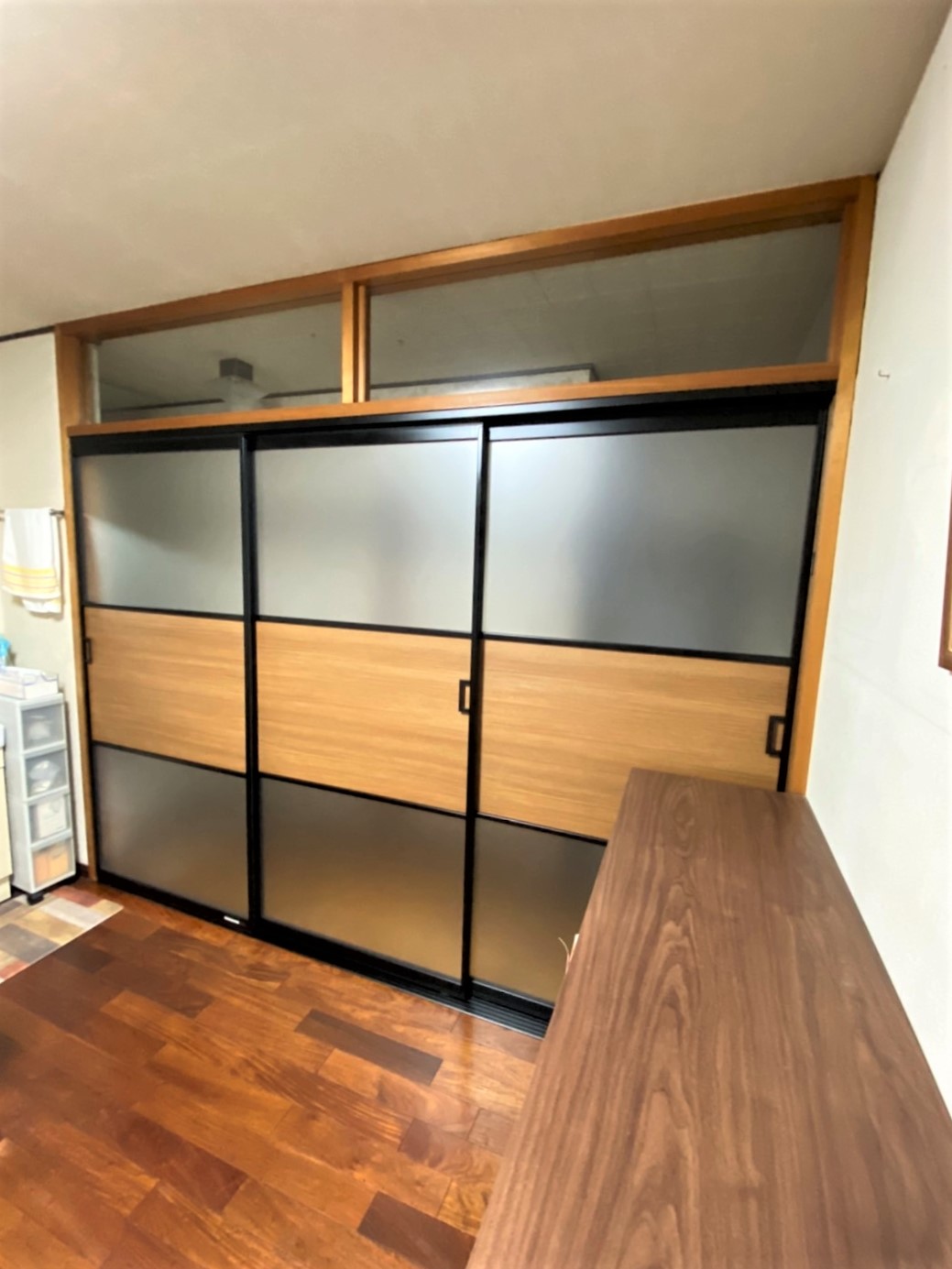 お孫さんがもたれかかって危ないとお悩みだったアコーディオンカーテンを撤去して、新たに間仕切り戸を設置。