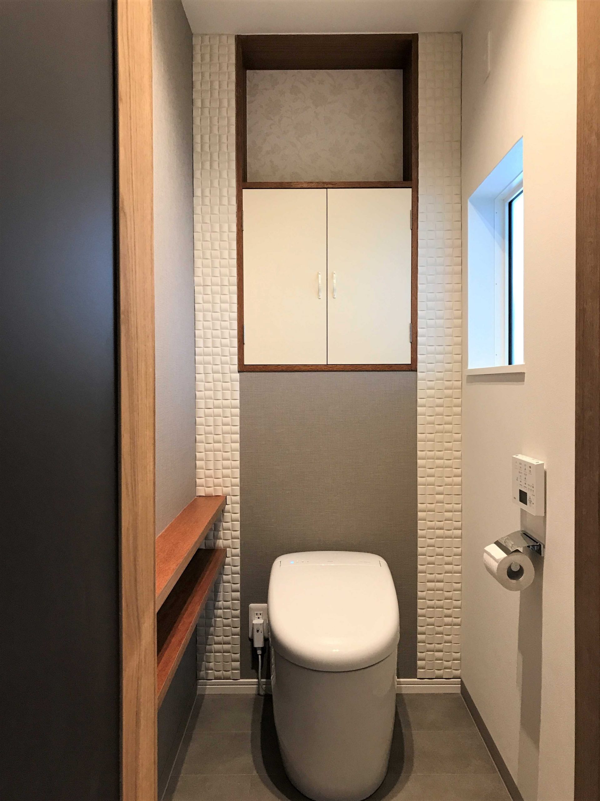 ドアノブは、開閉しやすいレバーハンドルに取替えて、トイレ内に棚手すりを付けることで安心してお使いいただけるようになりました。