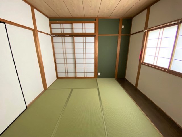 和室は、抜けかけている釘の打ち込みなどしっかりと下地処理を施し、お客さまご希望のアクセントクロスを貼りました。