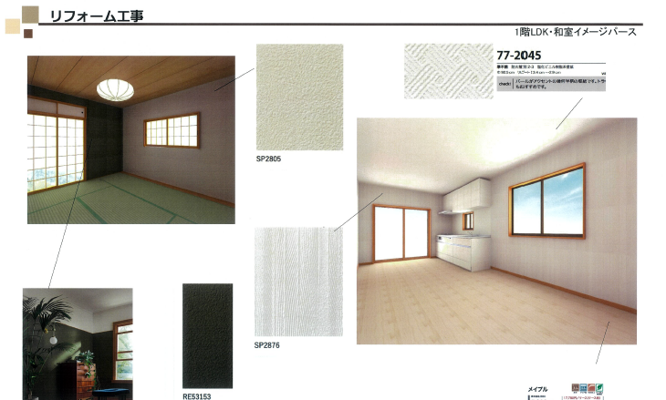 床補強工事、システムキッチン取替え、トイレ取替え、LDK・玄関・廊下・2階洋室のフロアタイル・クロス貼替え、間仕切り壁造作工事、和室の畳・クロス貼替え、エアコン2台取替え -