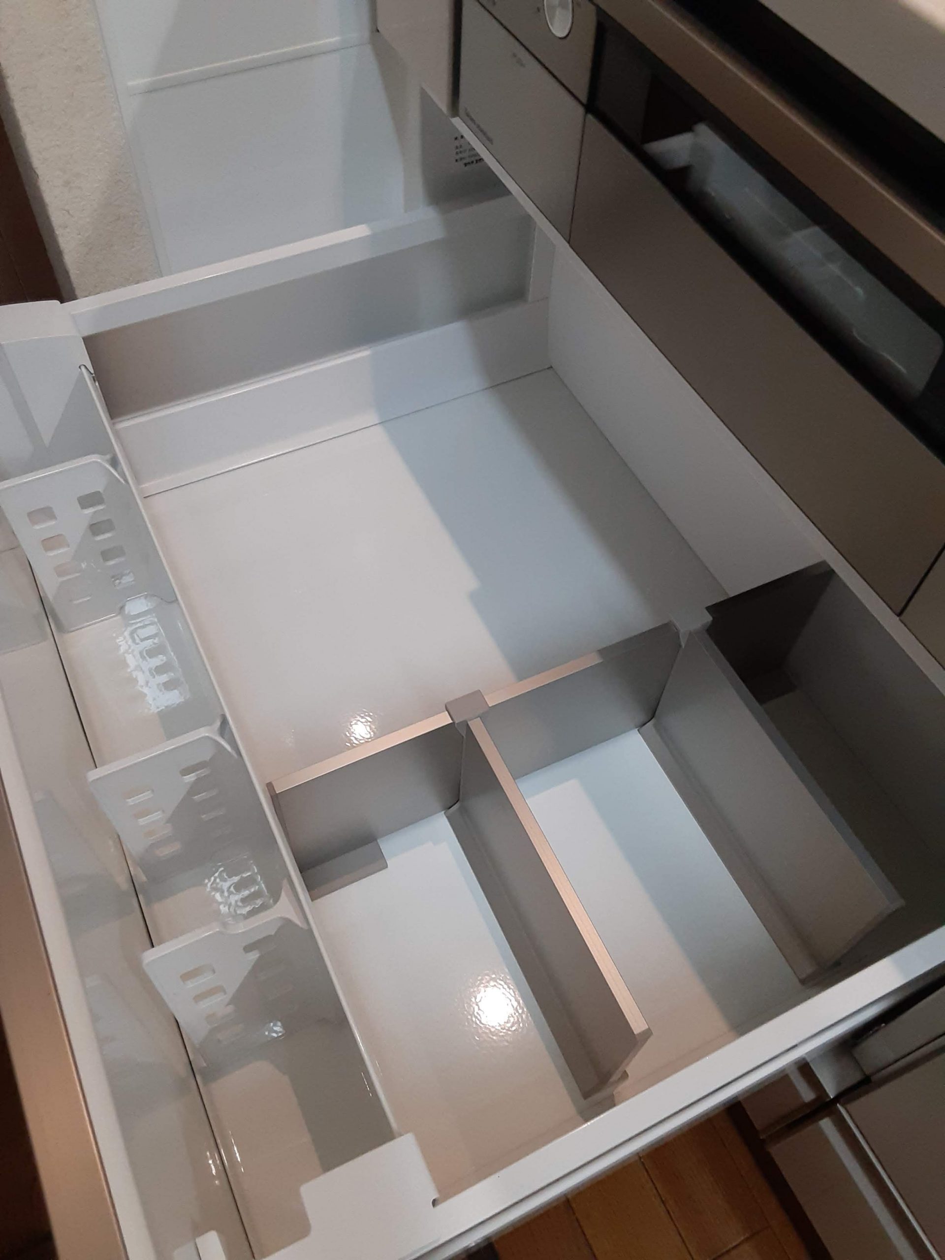 出っ張っていた引き出しの取っ手がなくなり見た目スッキリ!収納スペースも観音扉から引き出しとなり、出し入れしやすくなったと大変喜んでいただくことができました。