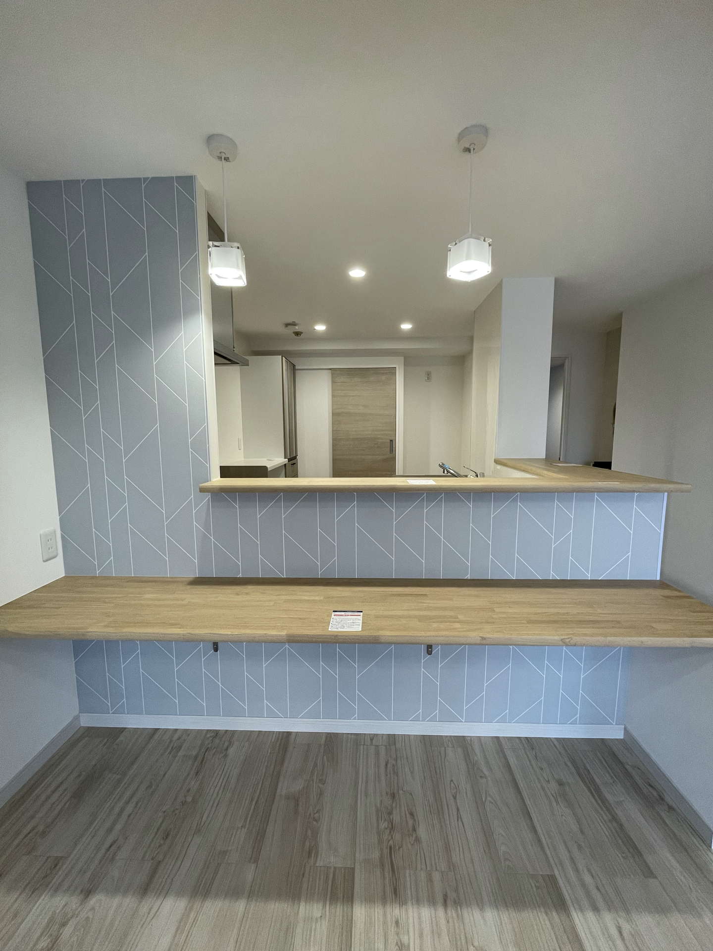 垂れ壁撤去、システムキッチン取替え、レンジフード取替え、床張替え、照明取替え