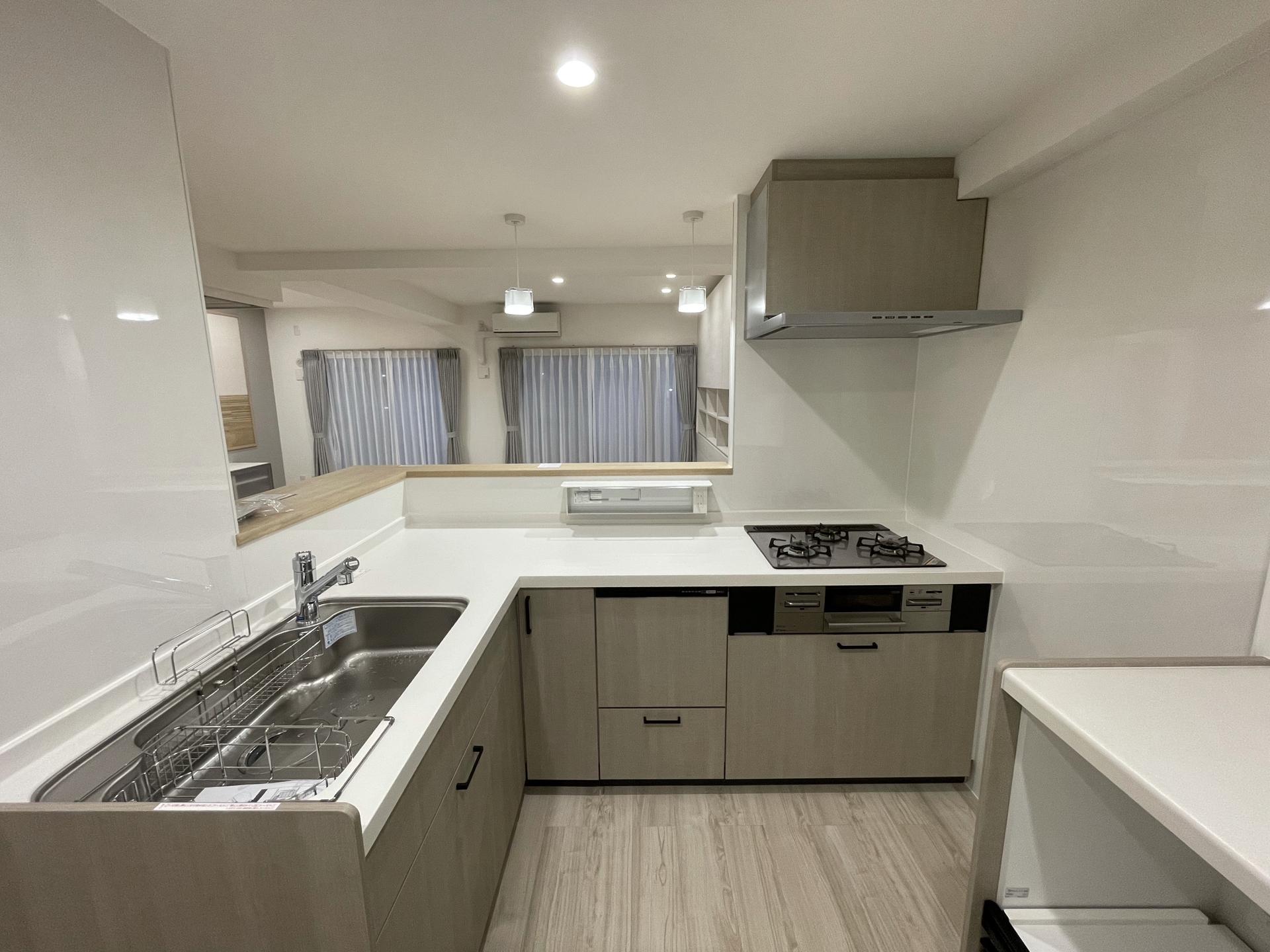 キッチンは、I型からL型にすることで広々とした作業スペースが生まれて使い勝手が良くなりました。また、垂れ壁を撤去することでリビングにいるご家族との会話も楽しめるようになりました。