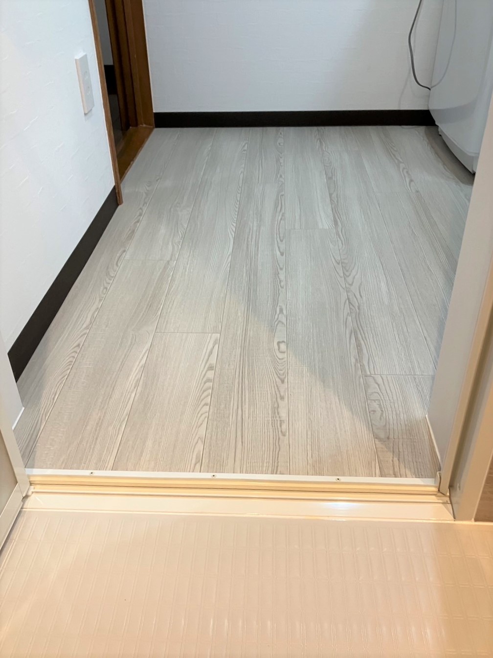 洗面脱衣室の床は、新しい洗面化粧台の色味に合わせて張替え。ダウンシーリングの照明に、天井のアクセントクロスで彩りをプラスして、ワンランク上の空間に仕上げました。