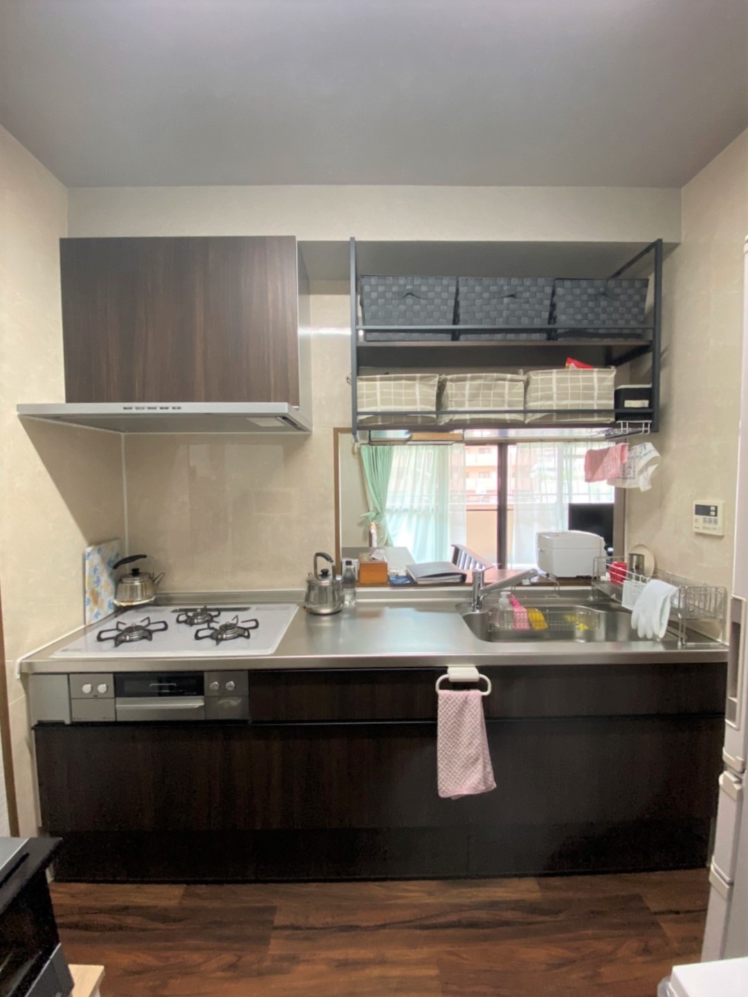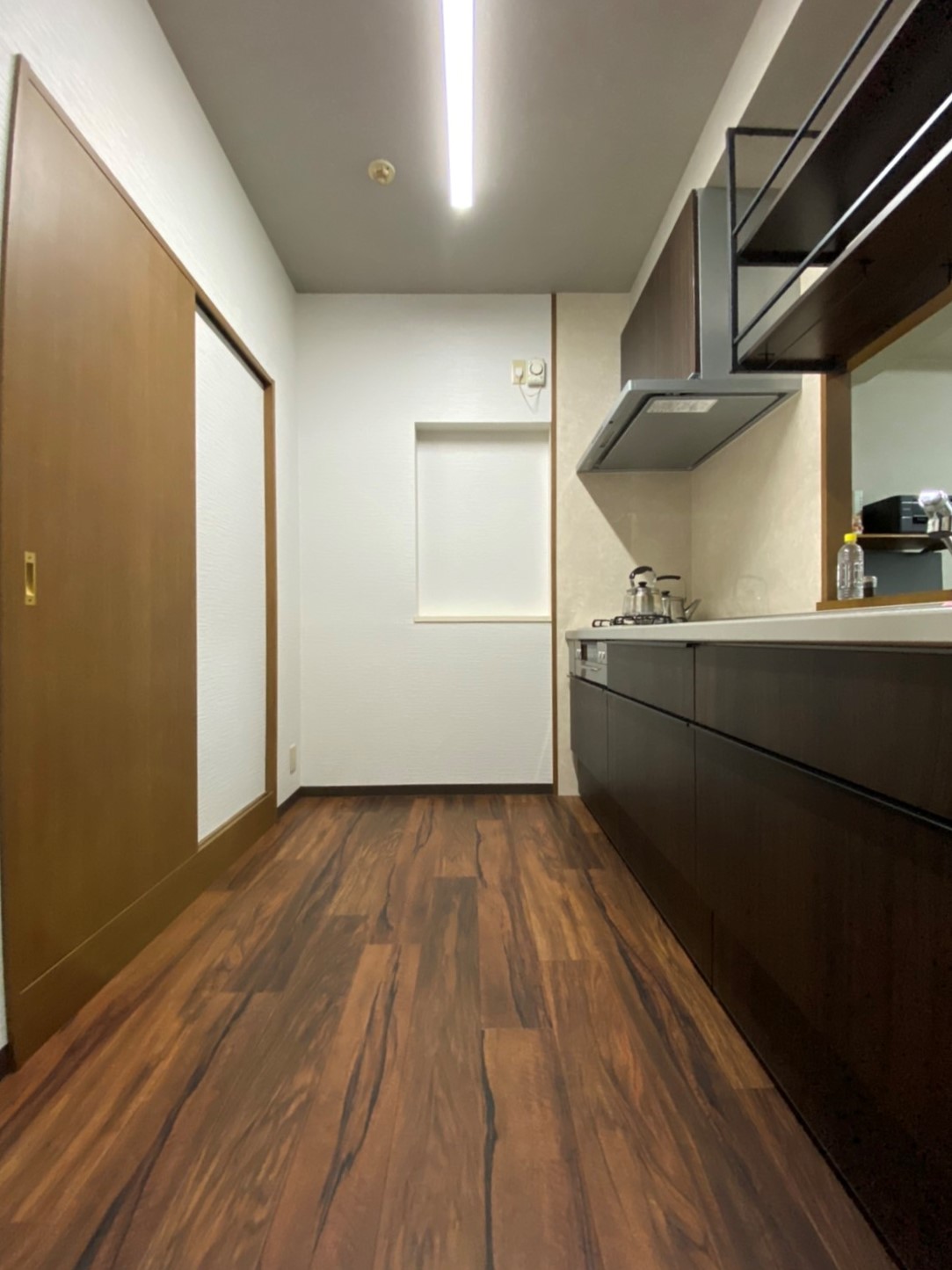 システムキッチン取替え、レンジフード取替え、床上張り工事、クローゼットの折れ戸を引き戸に取替え -