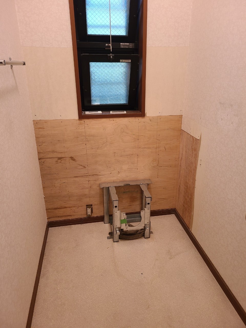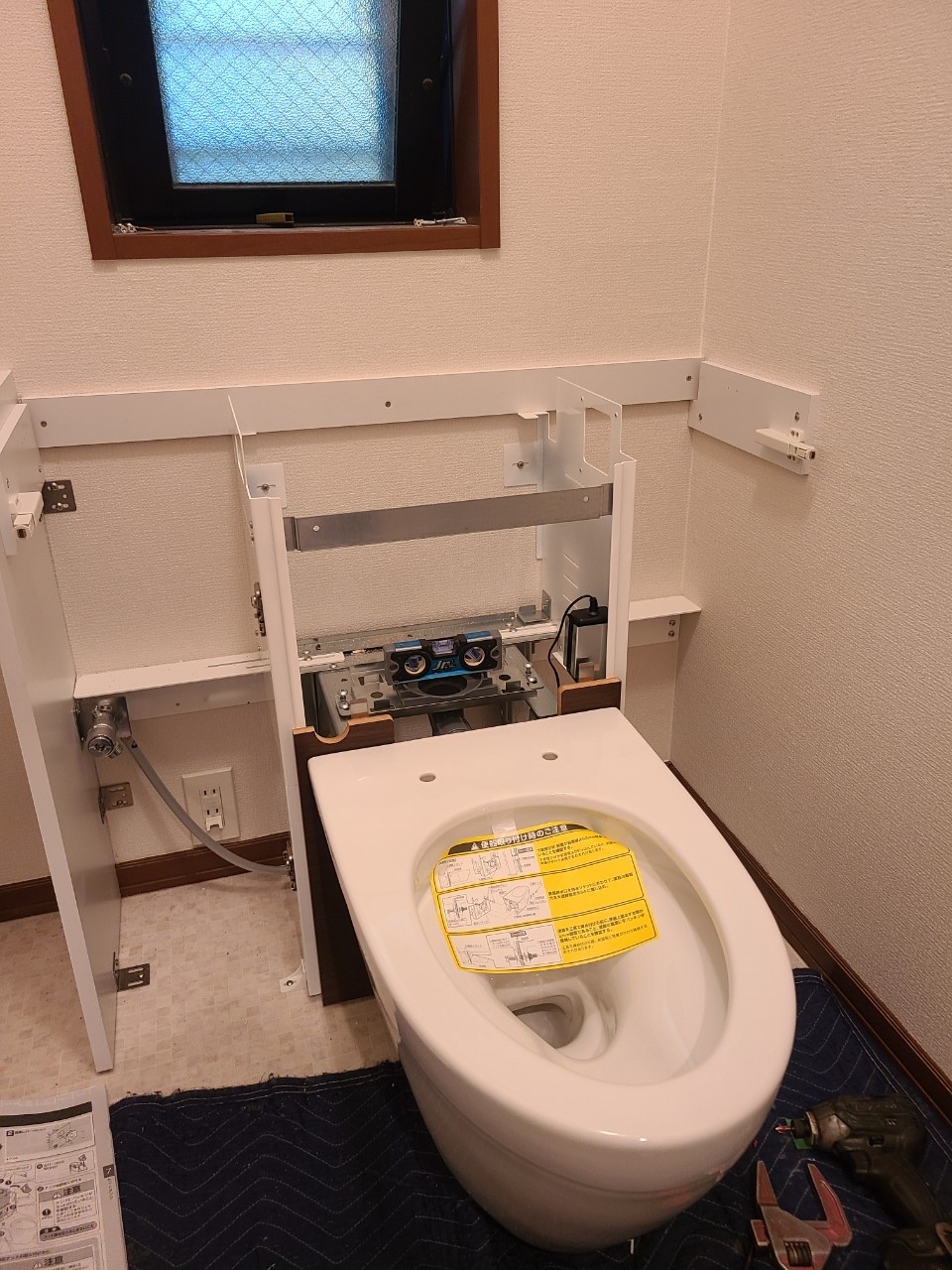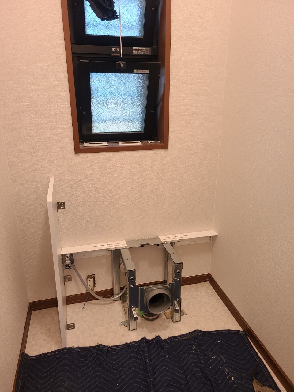 1階のトイレは、宙に浮いているかっこいいタイプをご希望とのことでしたので、しっかりと壁の補強をおこない、キャビネット内の取付スタンドに便器を固定。