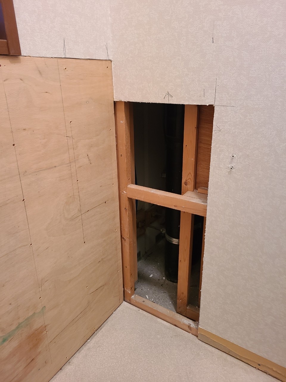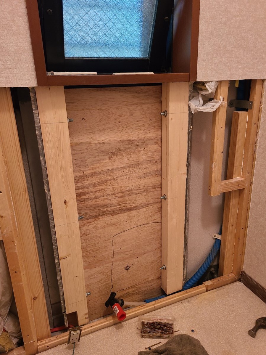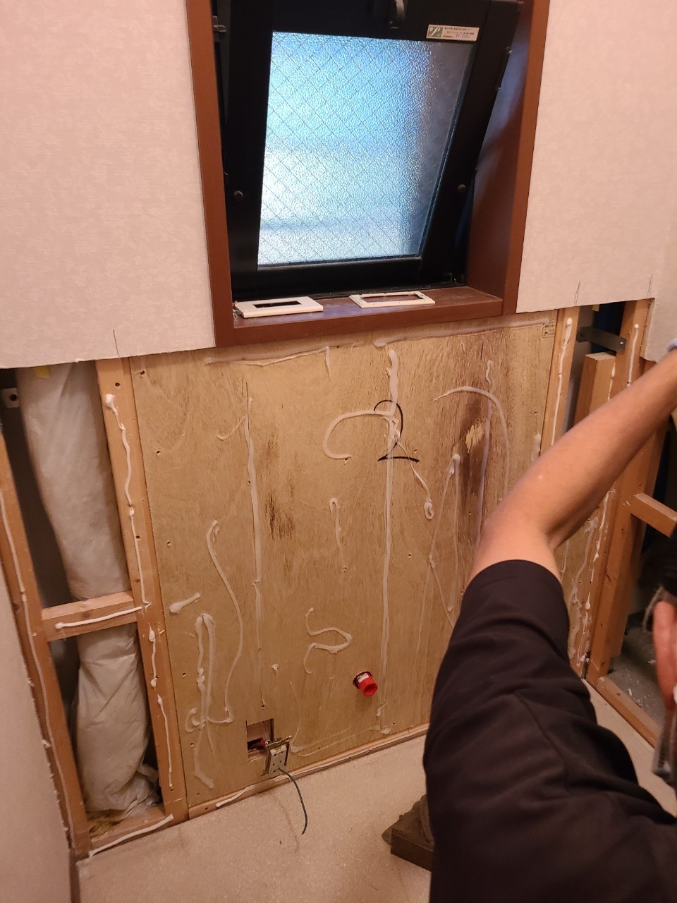 1階のトイレは、宙に浮いているかっこいいタイプをご希望とのことでしたので、しっかりと壁の補強をおこない、キャビネット内の取付スタンドに便器を固定。