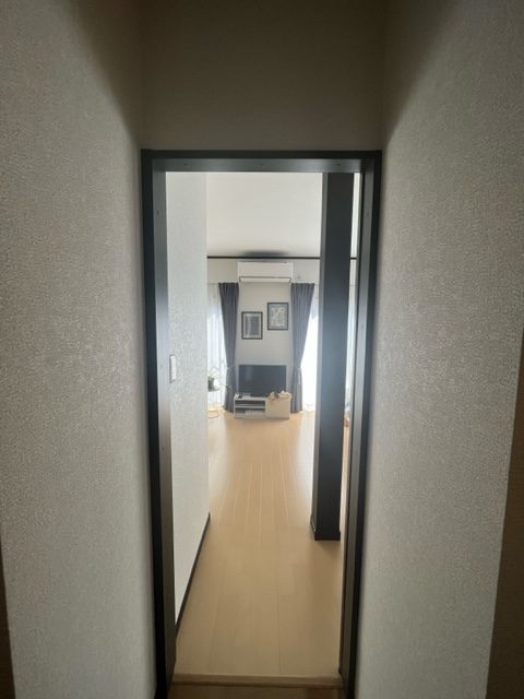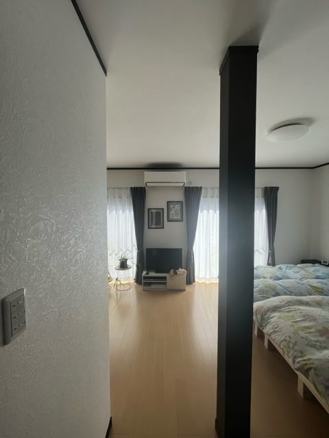 通し柱の一方はクローゼットの角に、もう一方の柱はアクセントクロスで目立たせるご提案をさせていただきました。