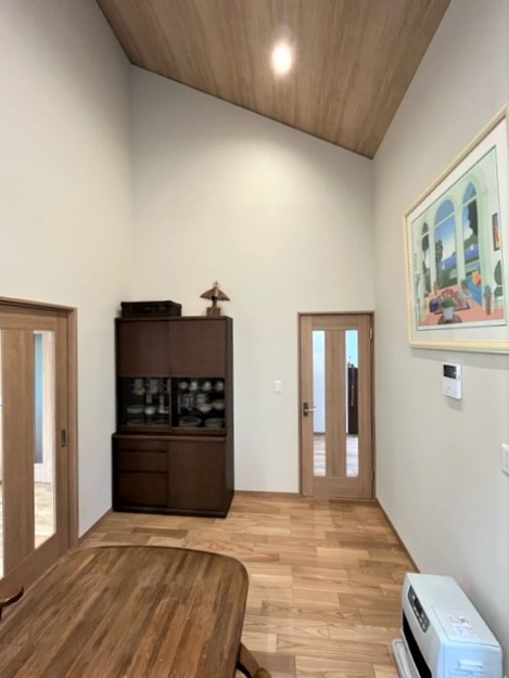 リビングの壁1面をグリーンベース、ダイニングの吹抜け天井を木目調のアクセントクロスにすることで、ワンランク上の空間を演出。