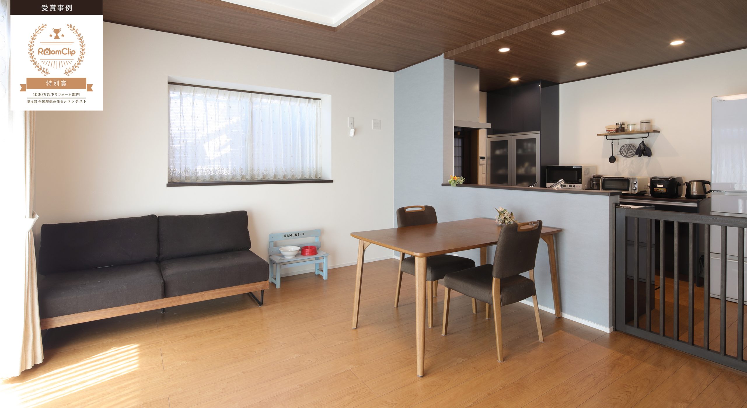 垂れ壁撤去、犬用ゲート造作、クロス貼替え、床張替え、照明取替え