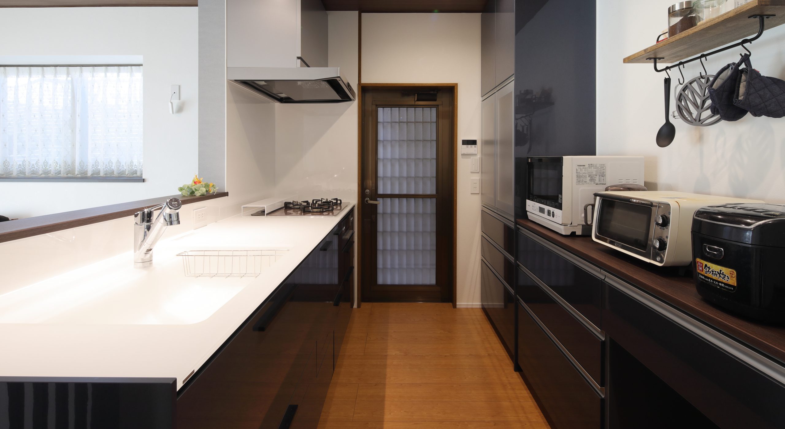 垂れ壁撤去、システムキッチン取替え、犬用ゲート造作、内窓設置、クロス貼替え、床張替え、照明取替え、玄関ドア取替え、下駄箱取替え、階段手すり改修、2階トイレ取替え -