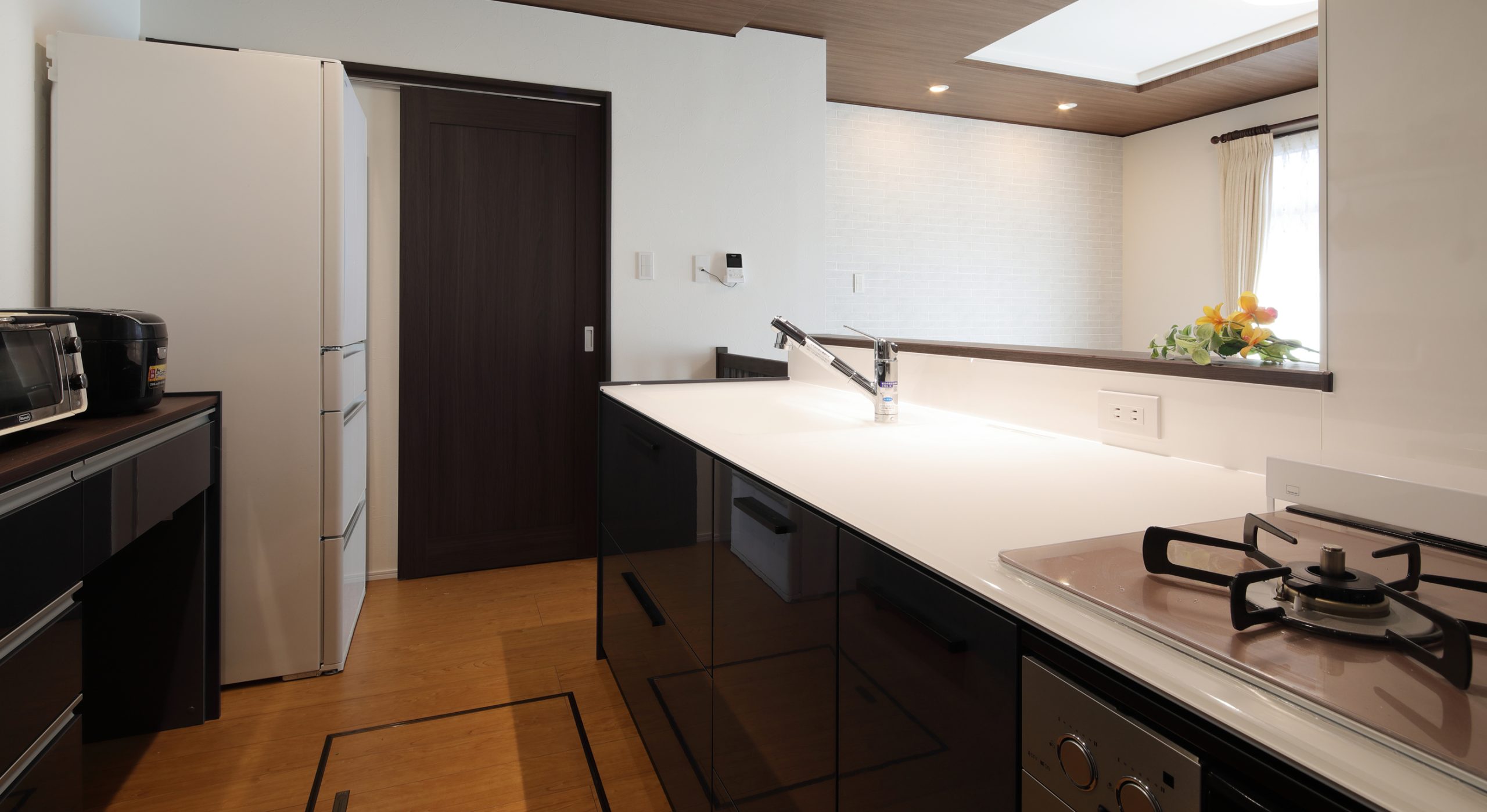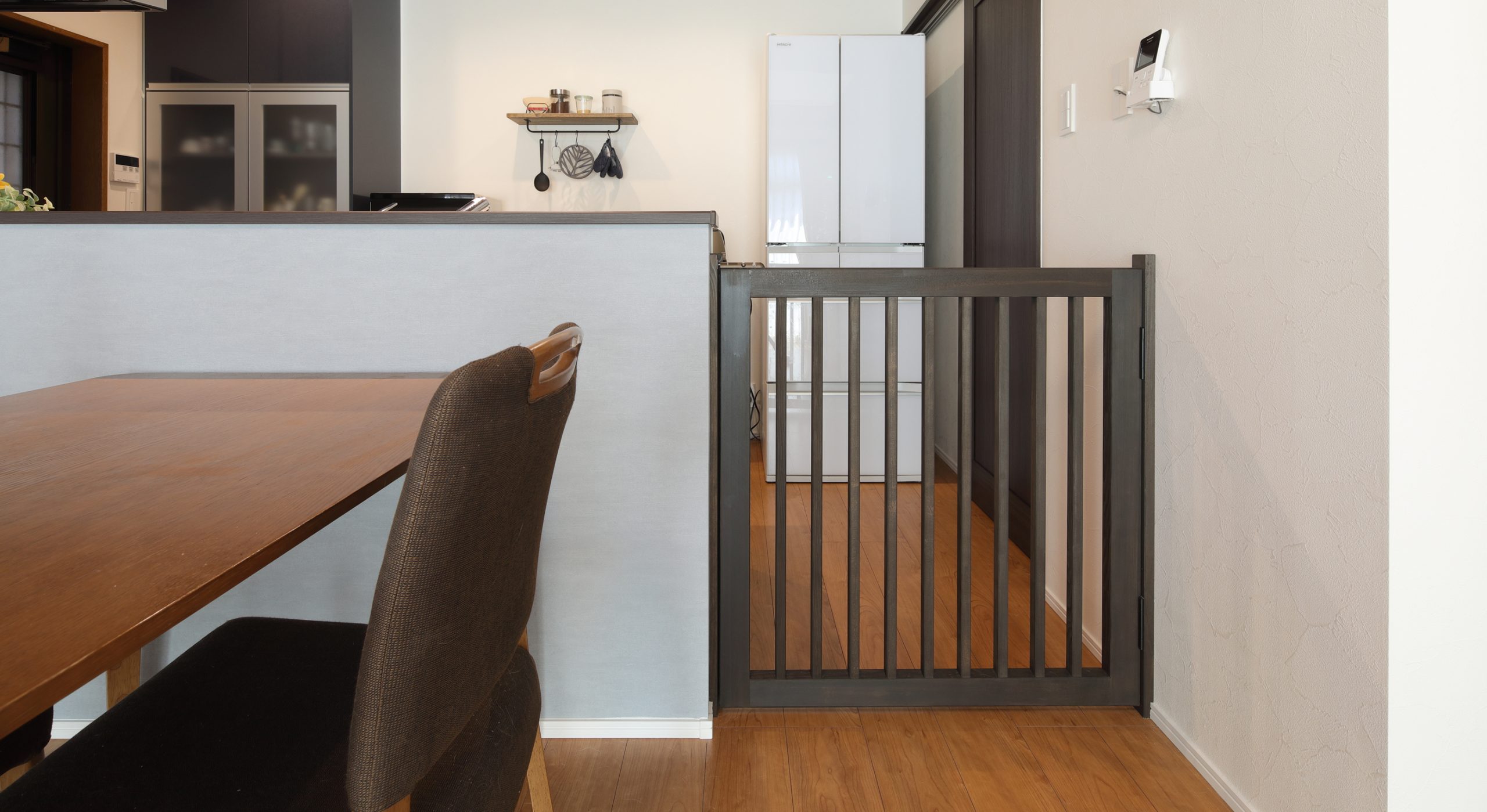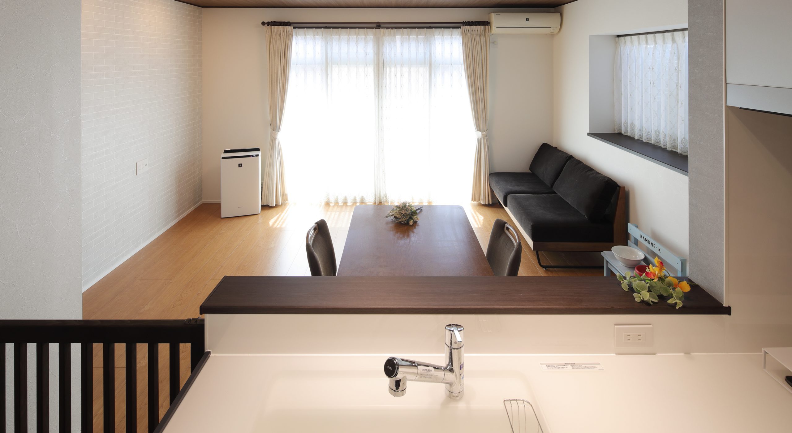 建具・ゲート・カウンター天板・出窓のケーシングの色味を合わせることで、空間の一体感を演出。