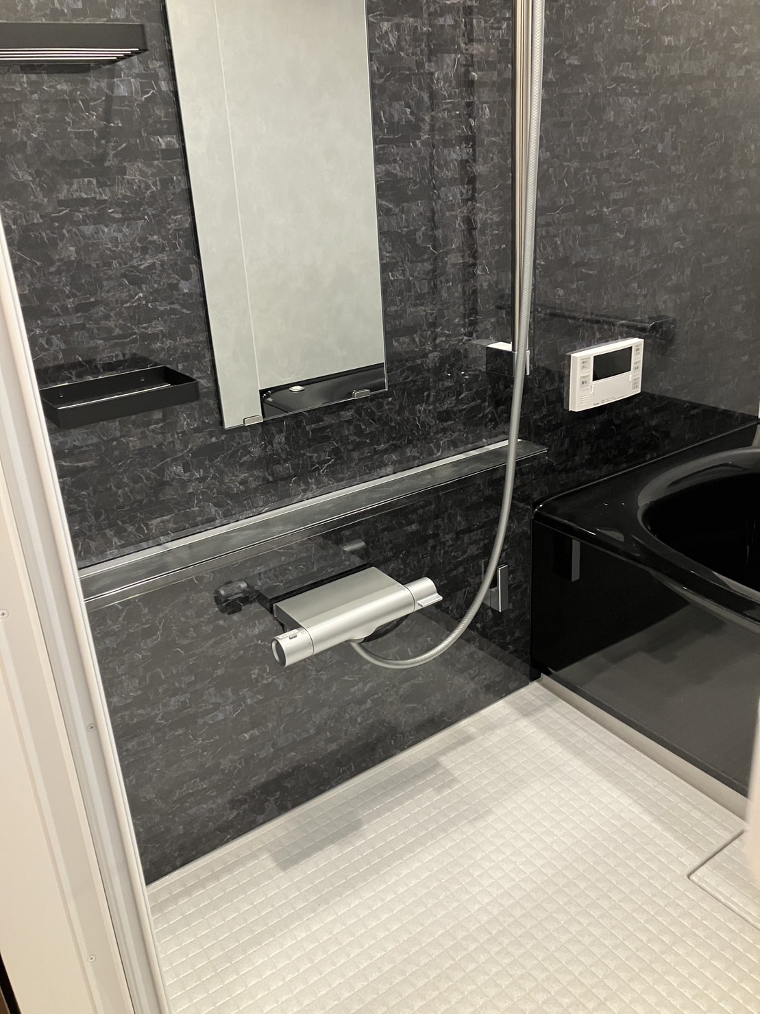 お客さまが一目惚れしたブラックの浴槽が映える高級ホテルのような空間に仕上げました。