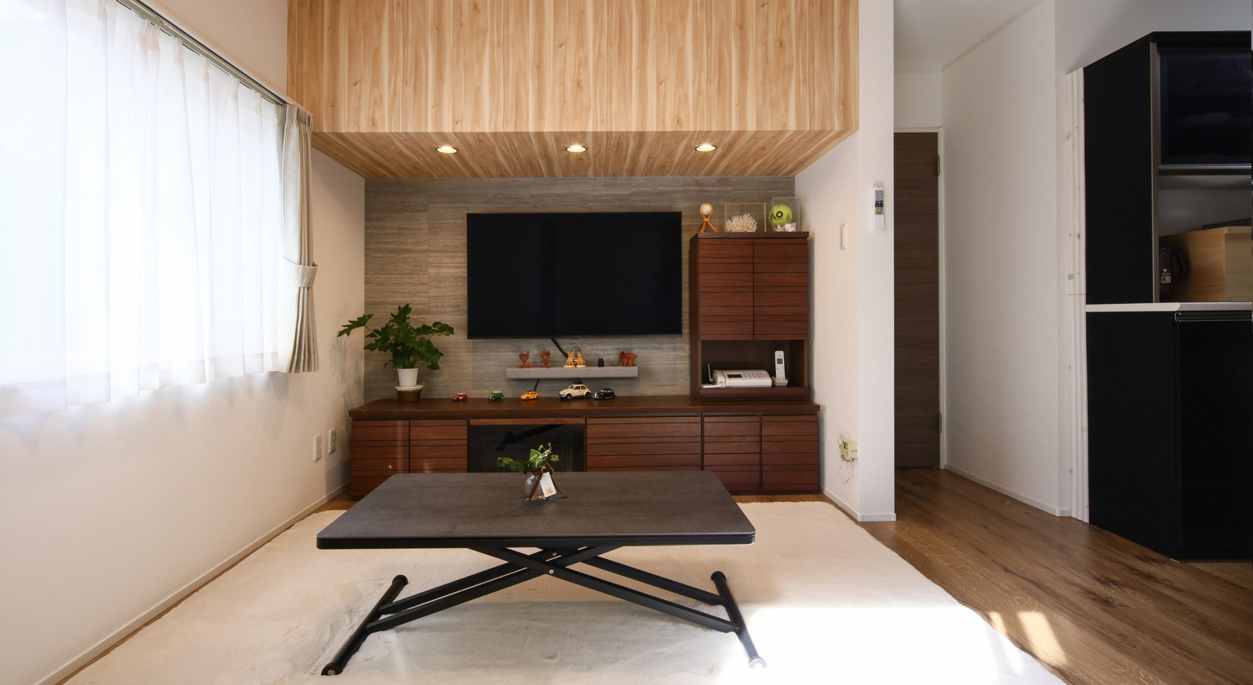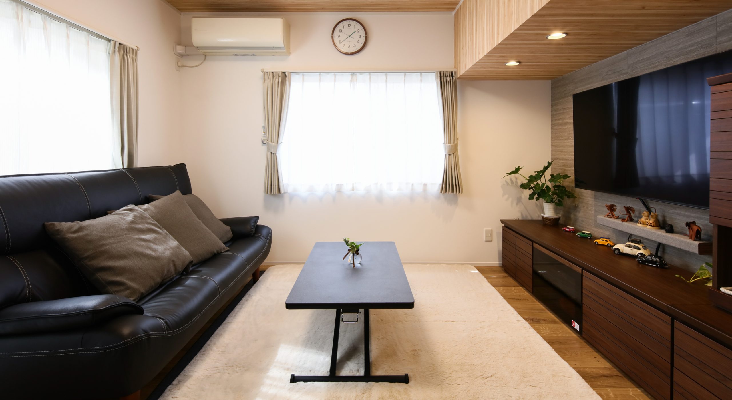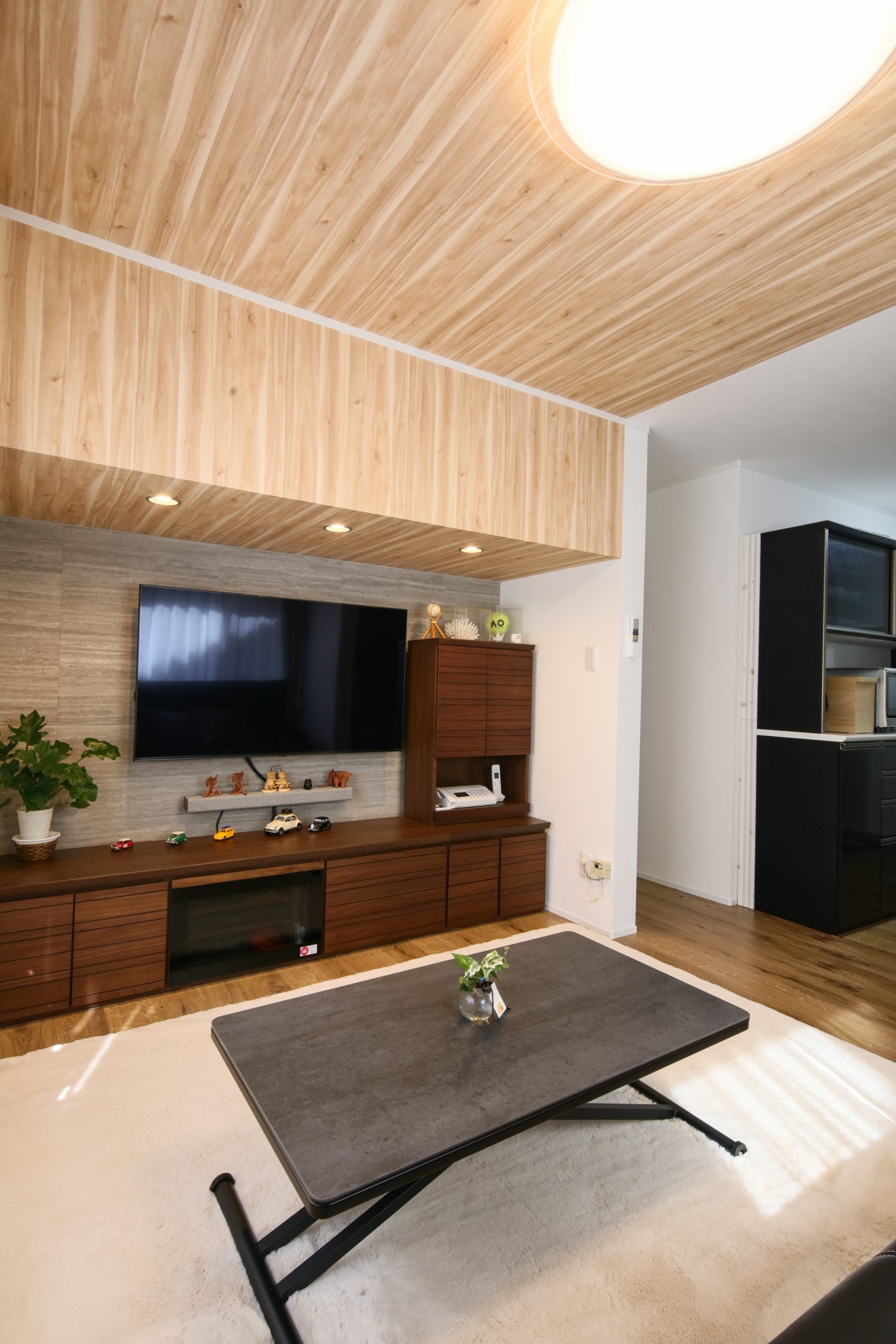 ご要望をお伺いする中で、ダイニングという場所は特に必要ないとのことでした。そこで、思い切ってダイニングスペースをなくして、くつろぎながら食事もできる広々としたリビングをご提案させていただきました。