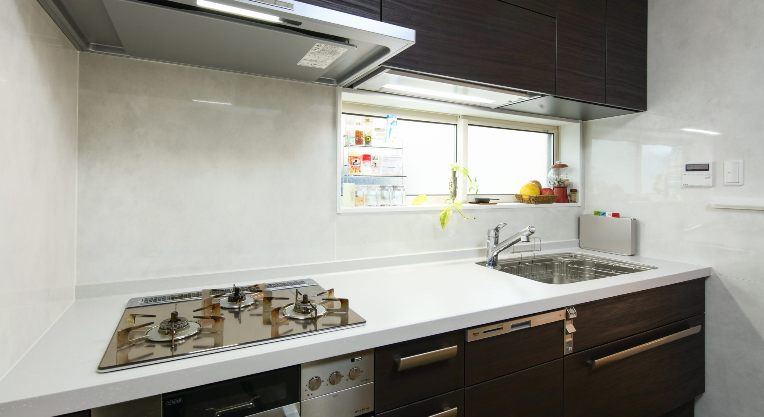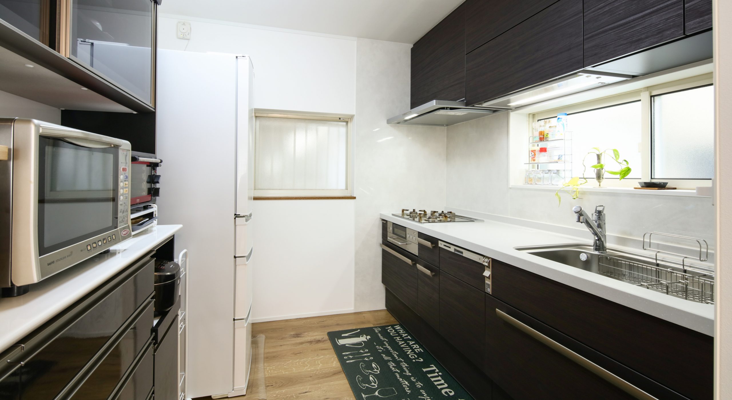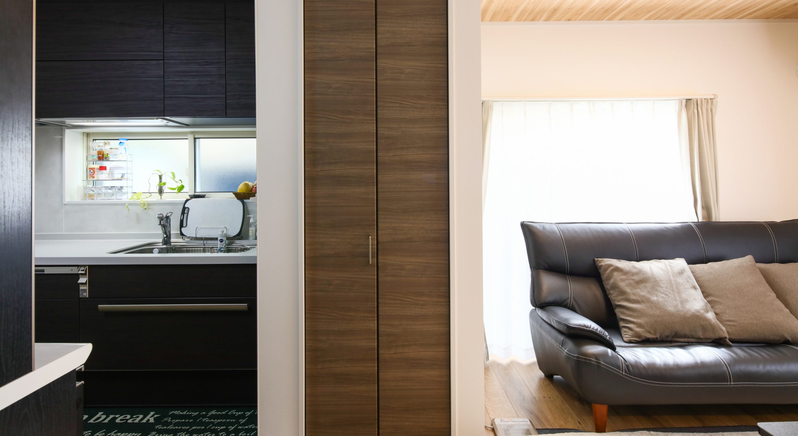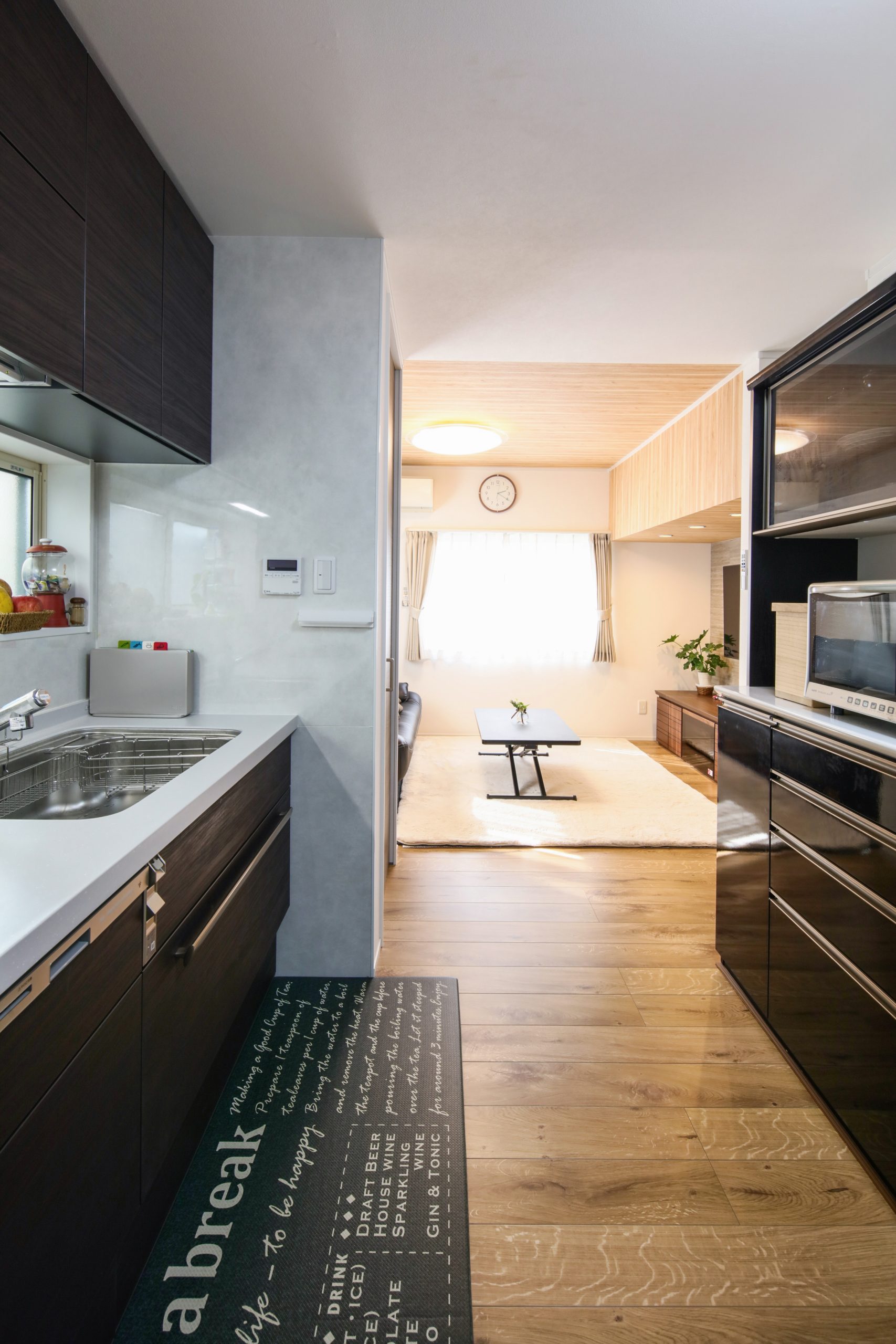 広くて快適にくつろげるリビングにしたいとのご要望をいただきました。キッチンは、ご主人と会話をしながら料理を楽しめる空間に。洗面脱衣室は、小物もすっきり収納できるスペースを確保したいとのことでした。