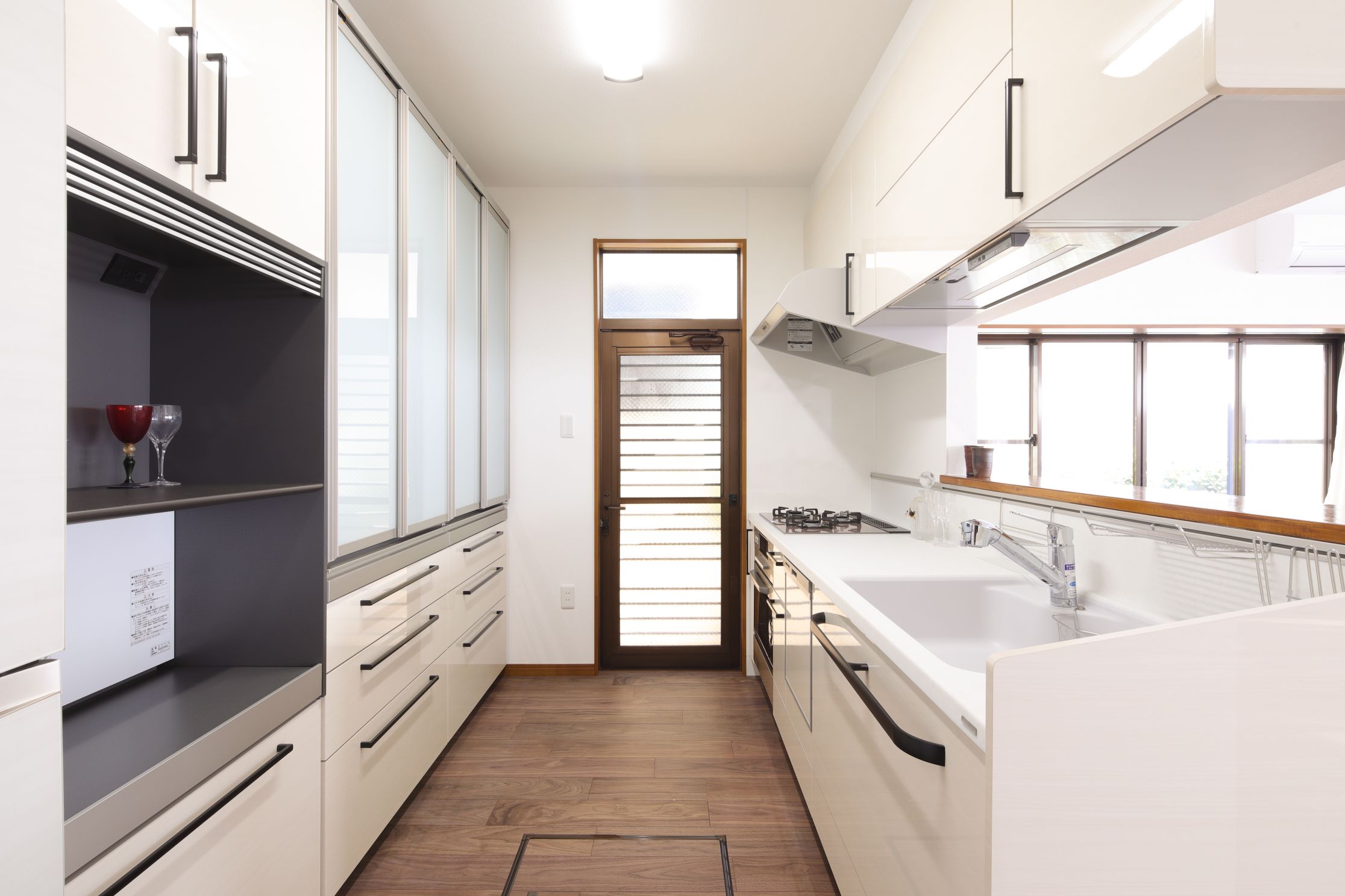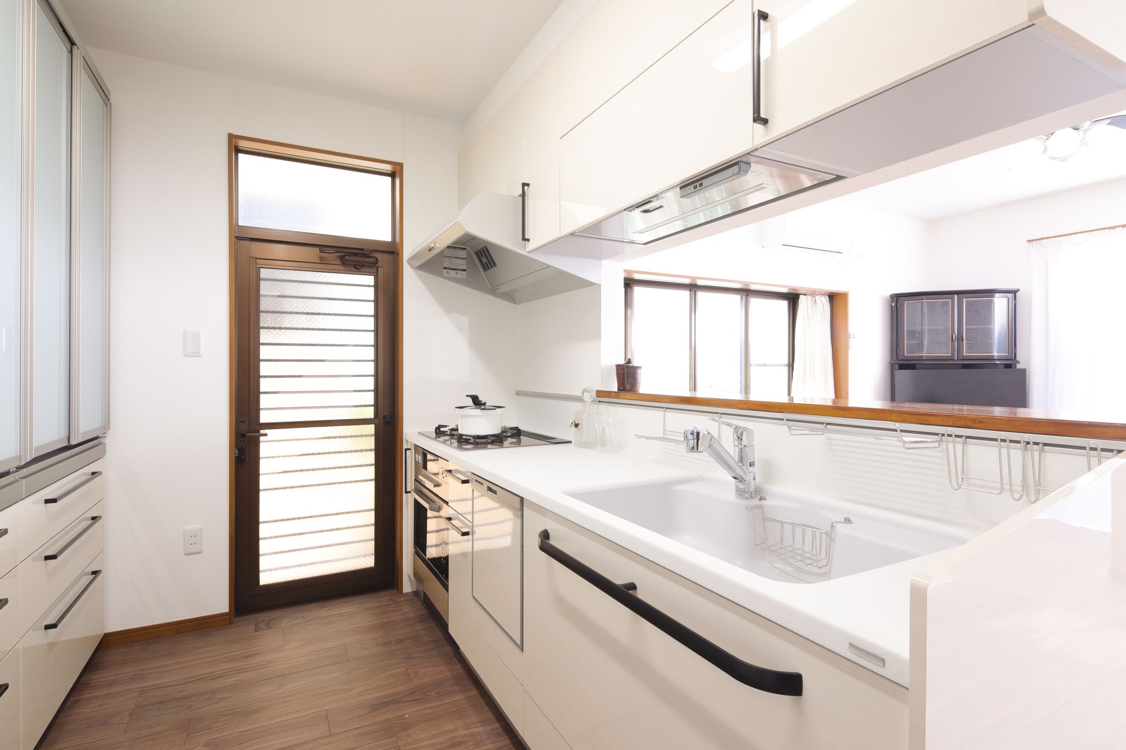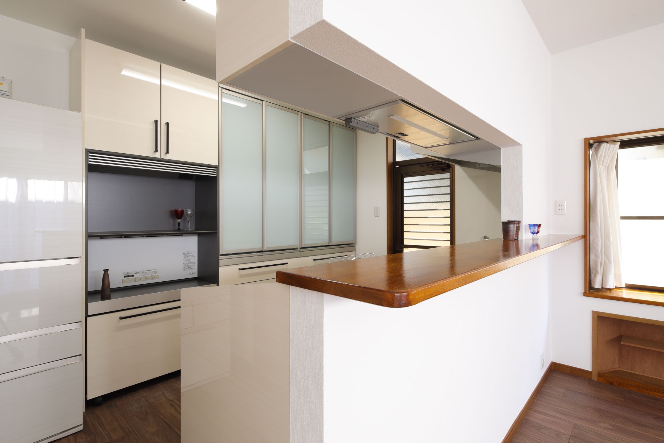カップボードは、開き戸から引き戸に変更して、省スペース化。