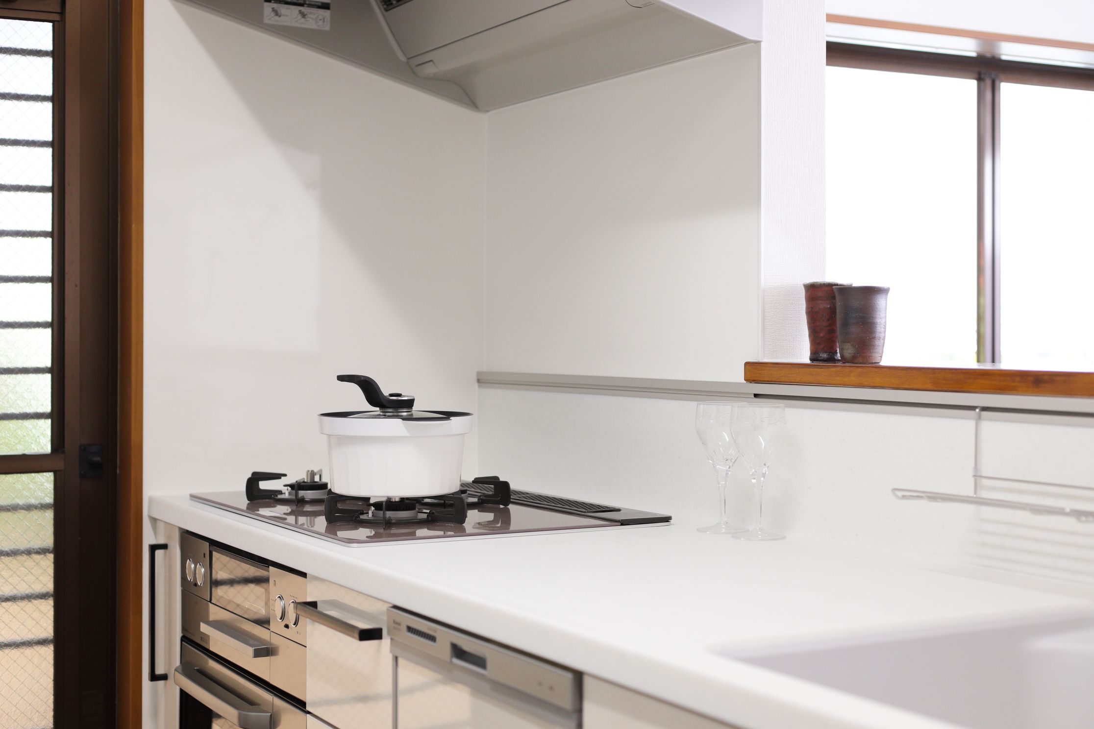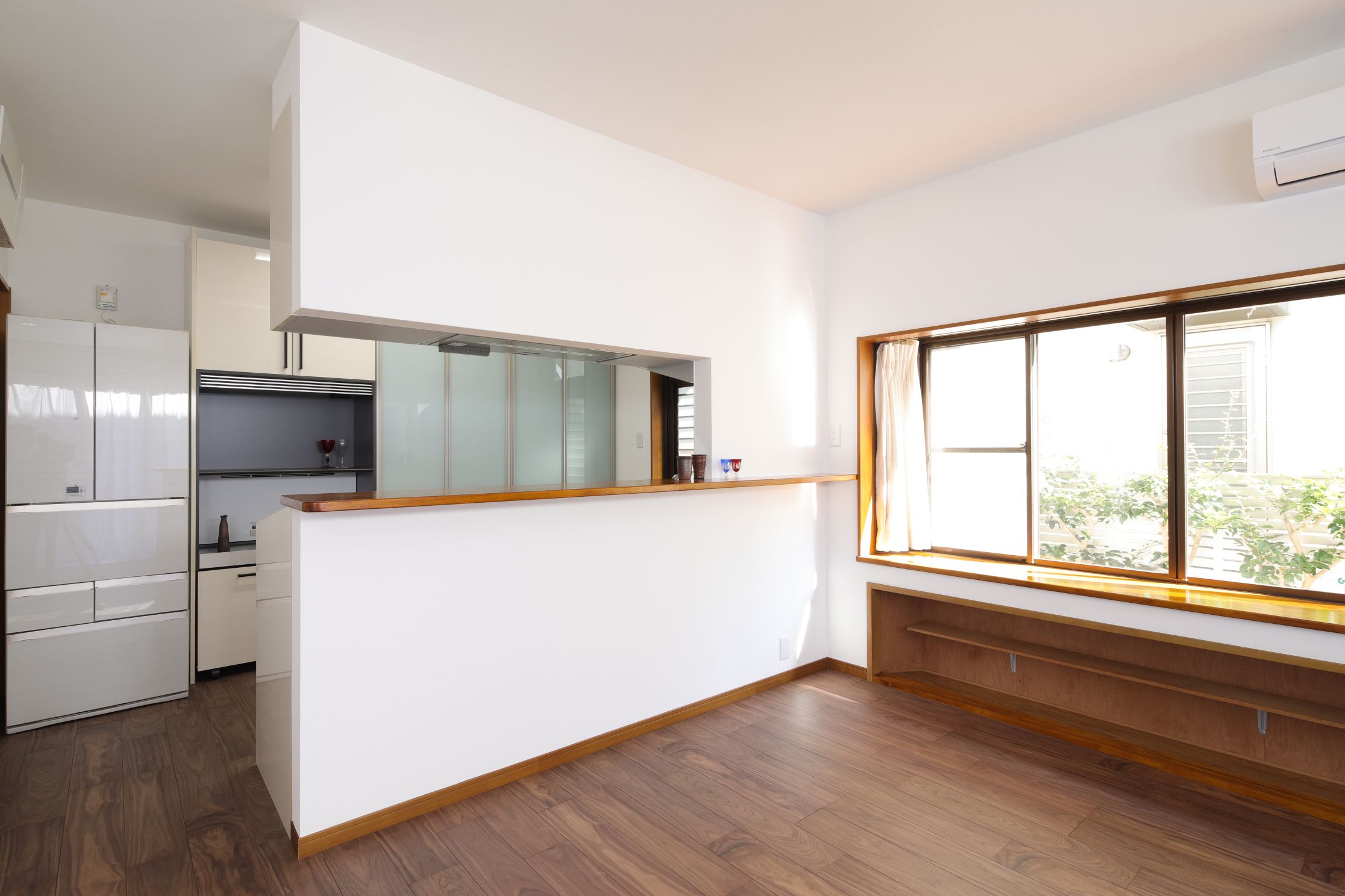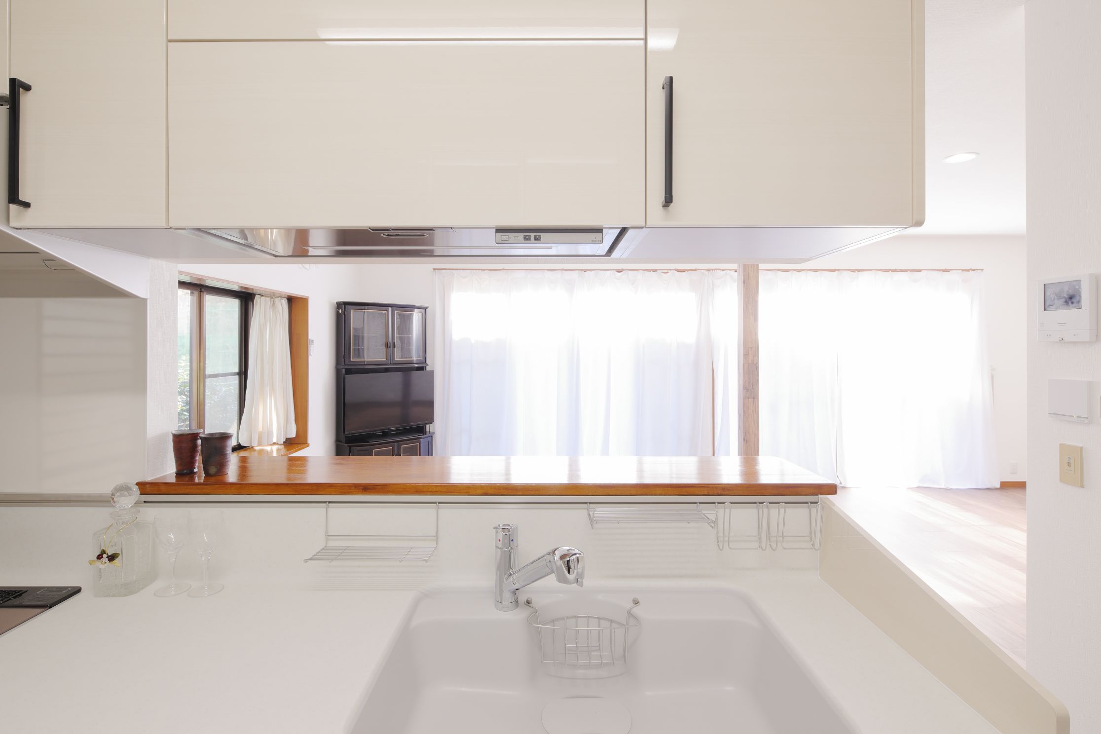 カップボードは、開き戸から引き戸に変更して、省スペース化。
