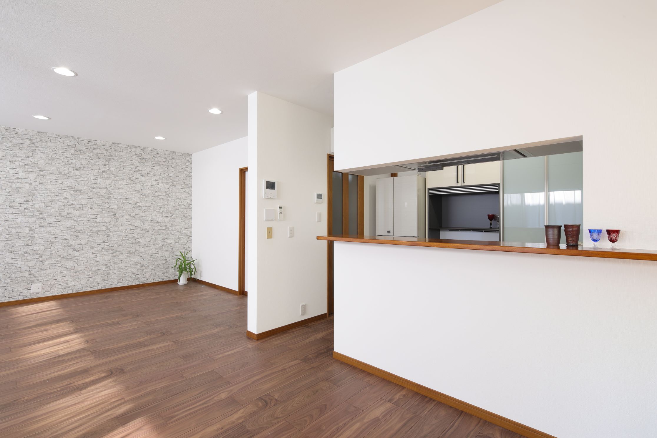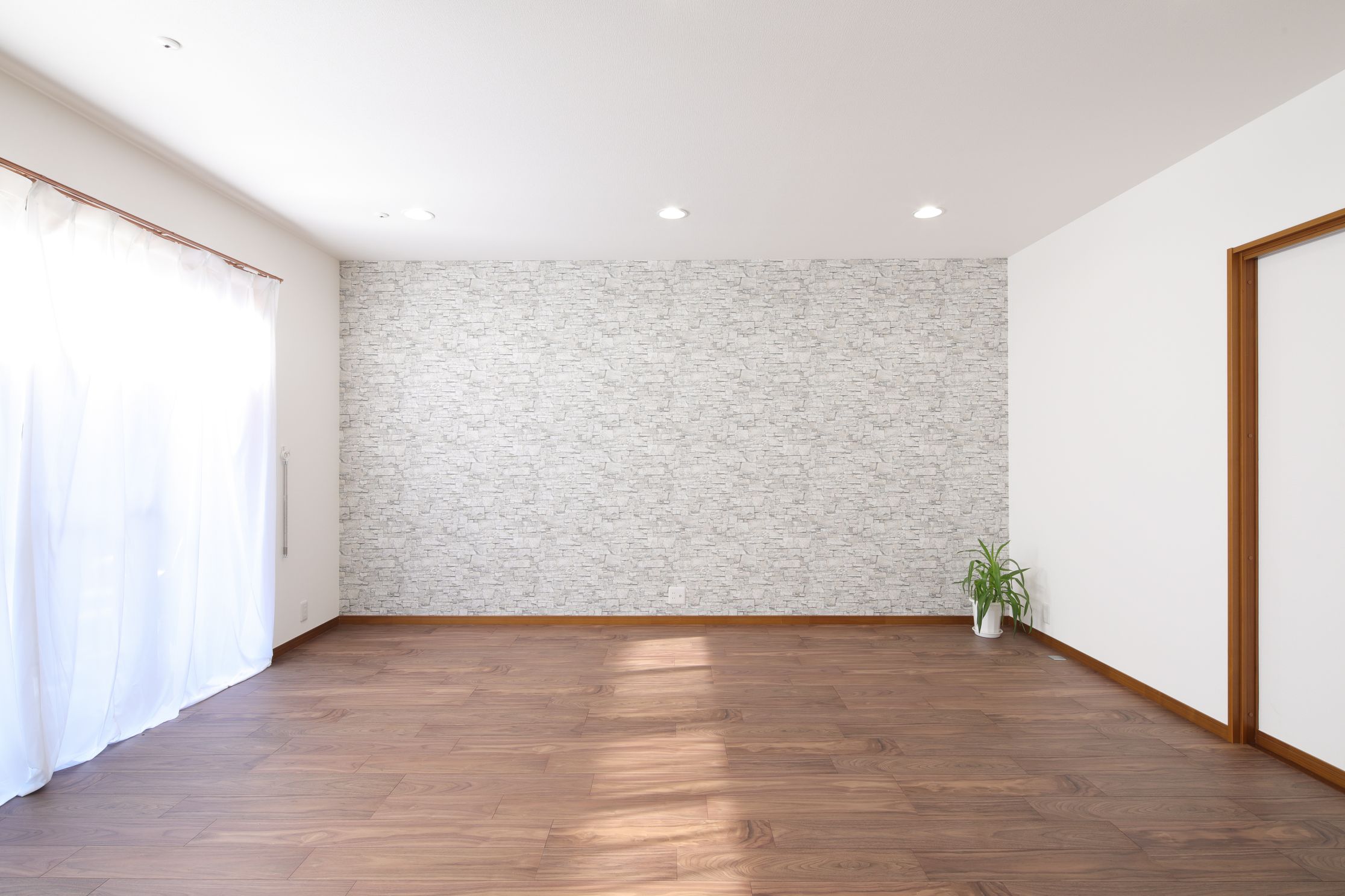 リビングの壁には、石目調のアクセントクロスを採用。