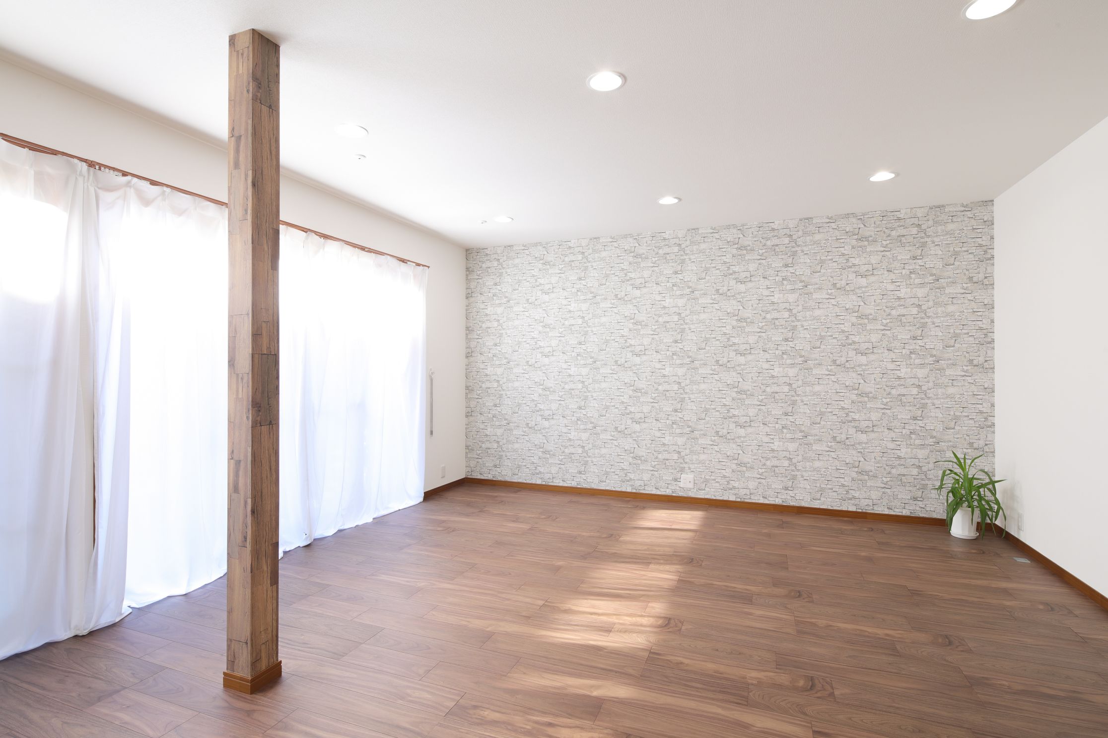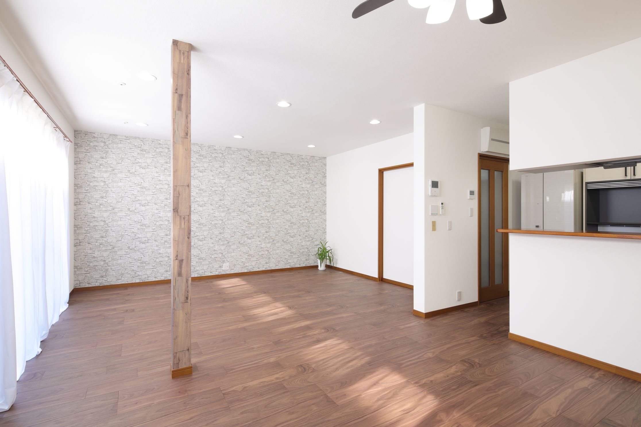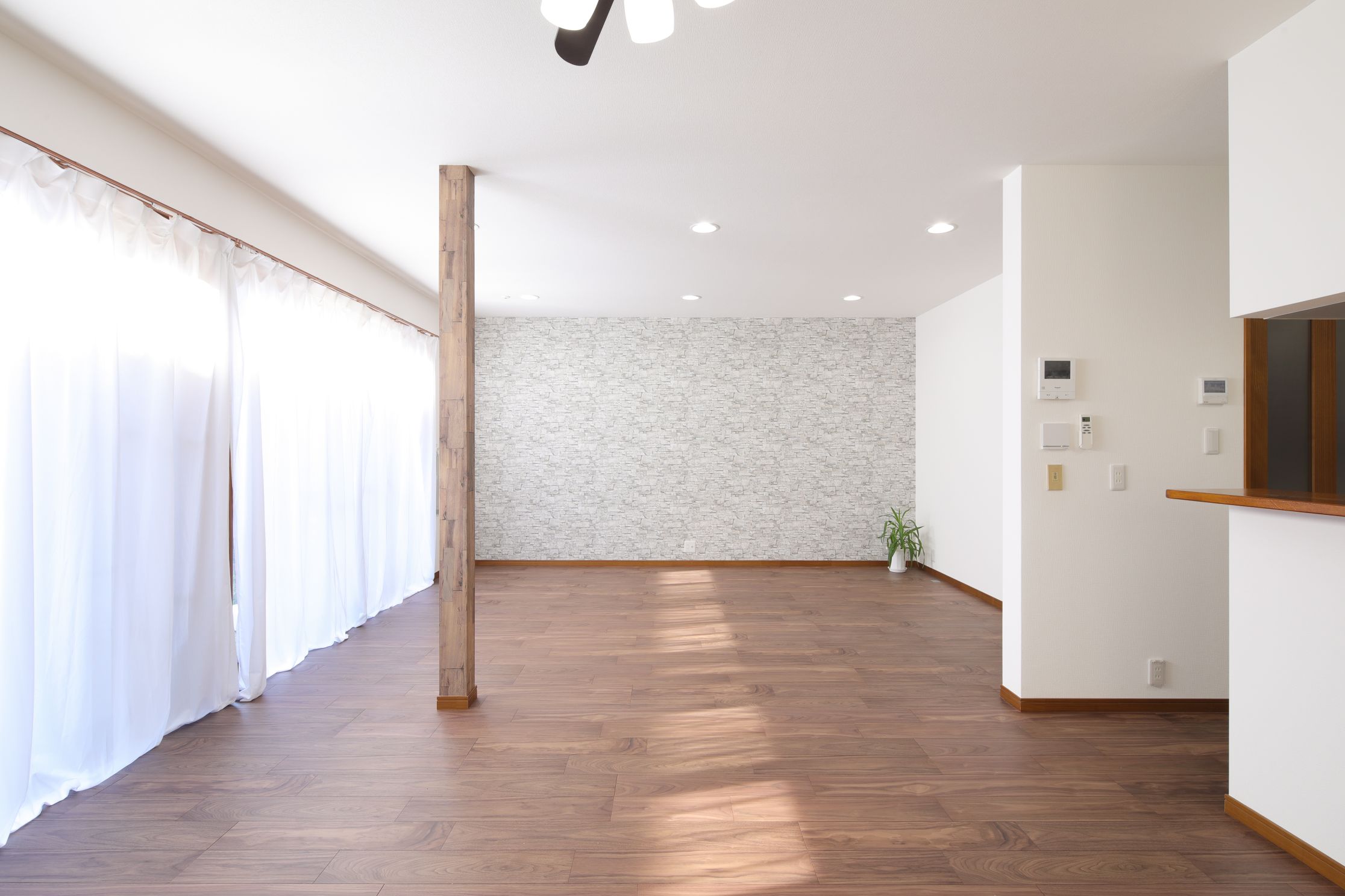 LDK中央にある柱は、将来的に愛猫のキャットウォークを設置できるように傷つきにくいクロスをご提案。