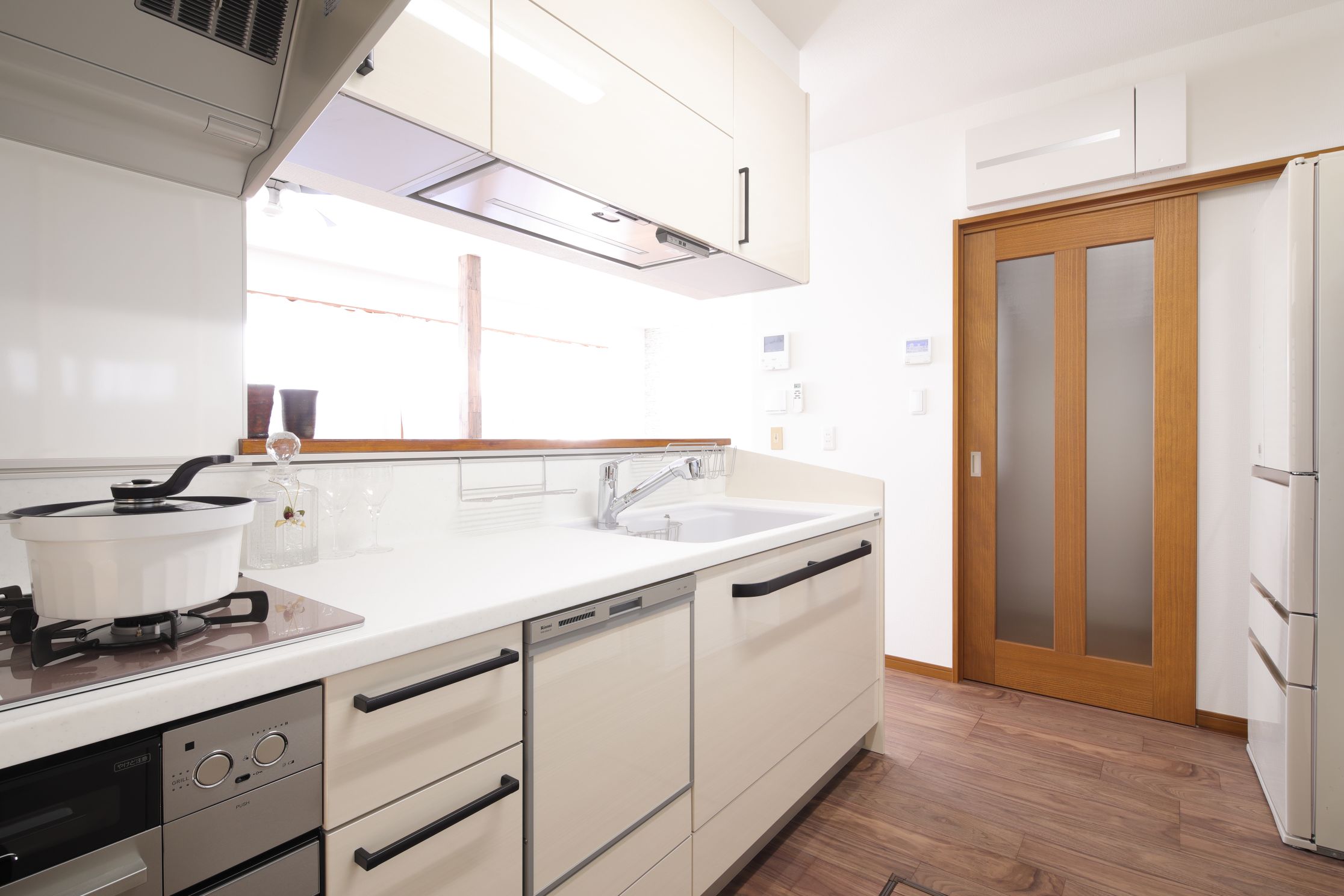 間取り変更、システムキッチン取替え、カップボード取替え、ガス温水式床暖房設置、天井・クロス貼替え、床張替え、建具取替え -