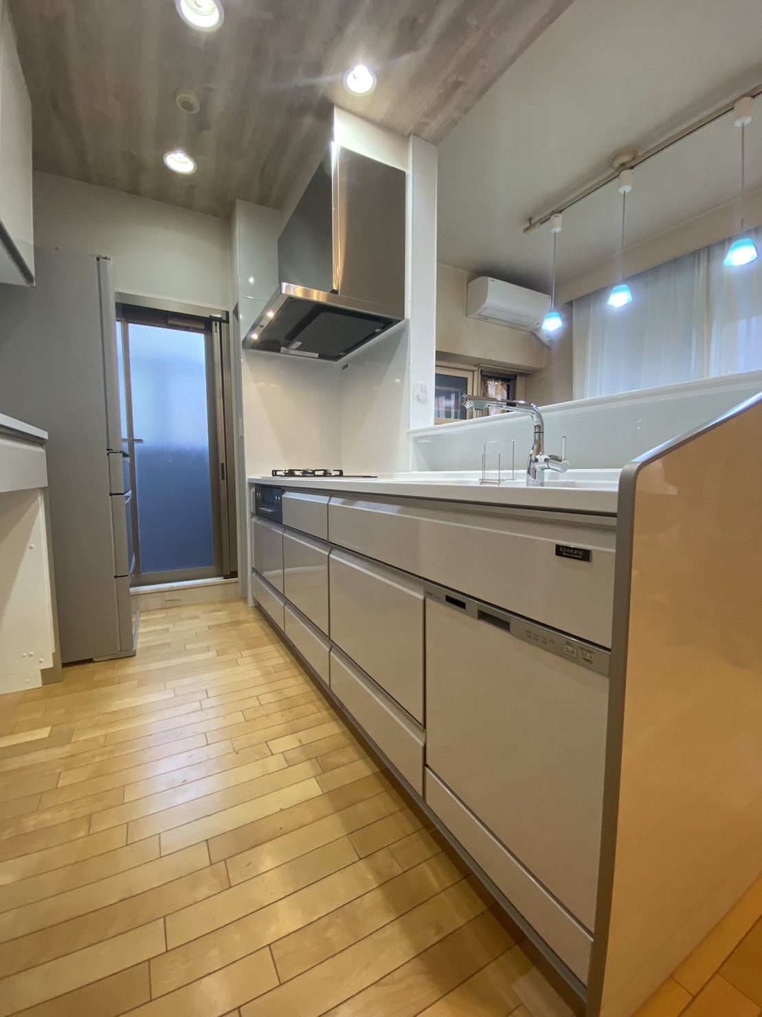 背面収納を大容量タイプに取替え、冷蔵庫の位置を見直すことでシンク前のスペースを広くお使いいただけるように仕上げました。