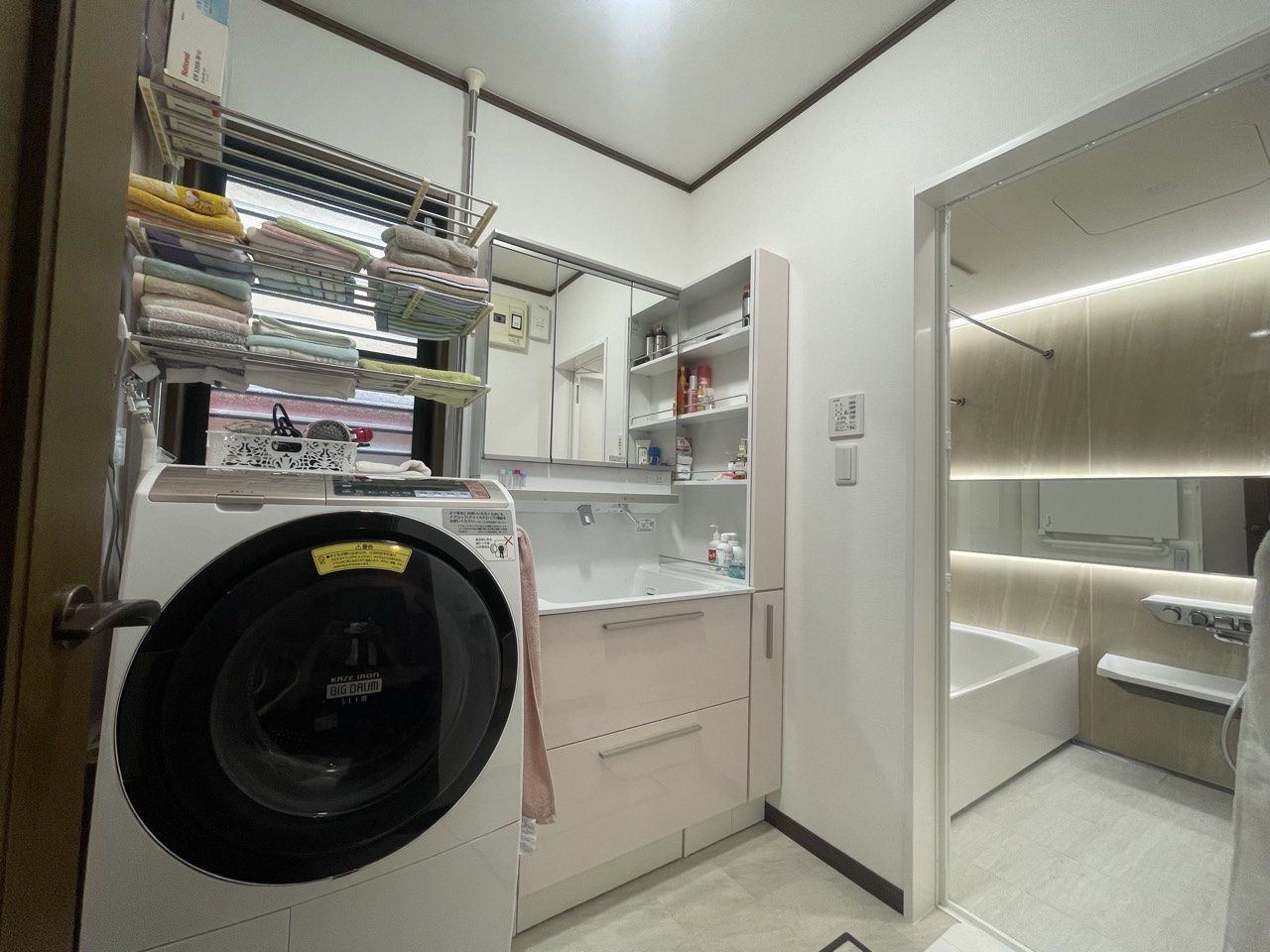洗面脱衣室は、収納スペースを見直してドラム式洗濯機と洗面化粧台が綺麗に収まるようにご提案。