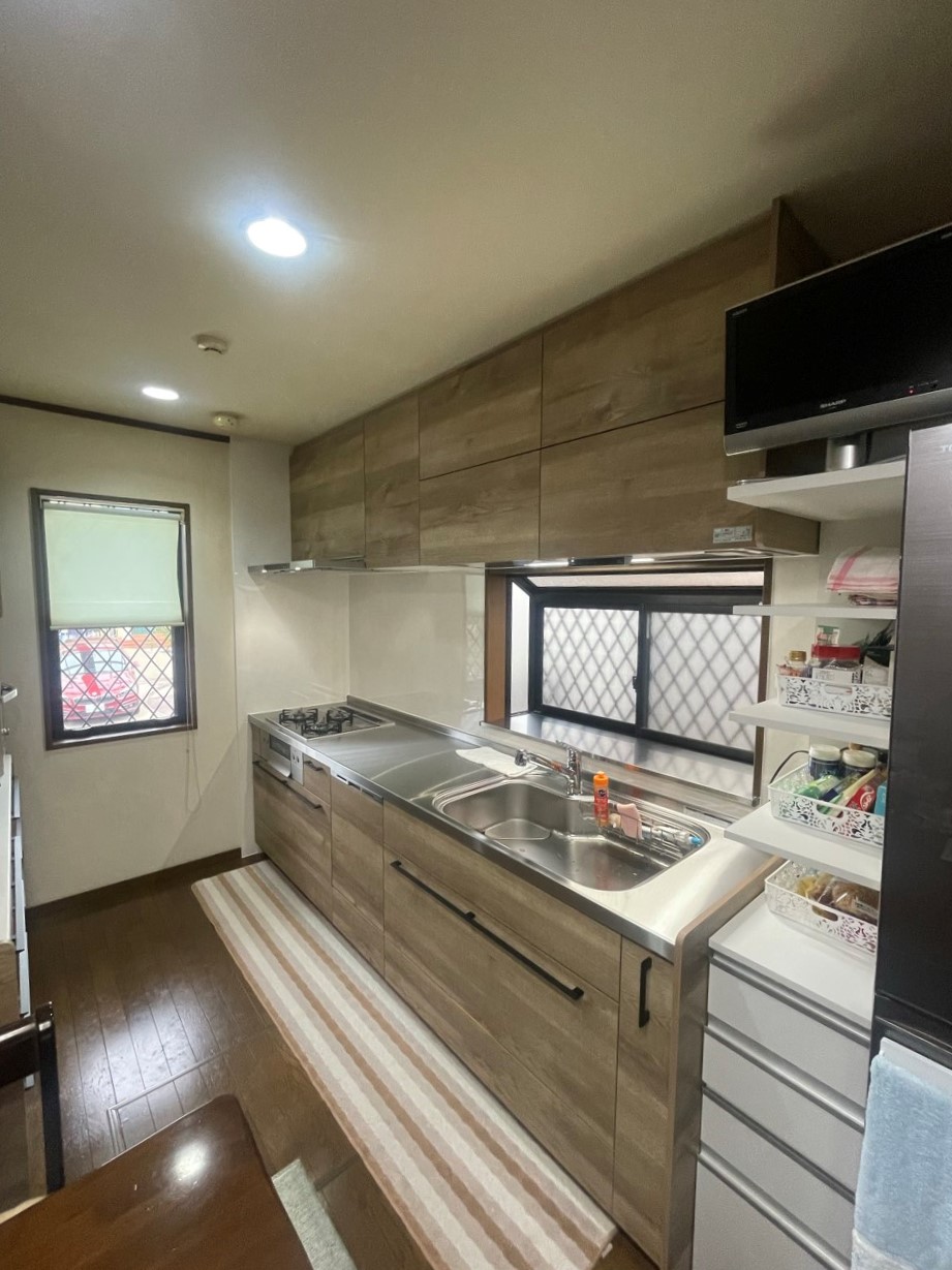 キッチンは、既存の背面収納を壁の内側でピッタリ収められるように、細かな寸法をおこなって商品を選定。