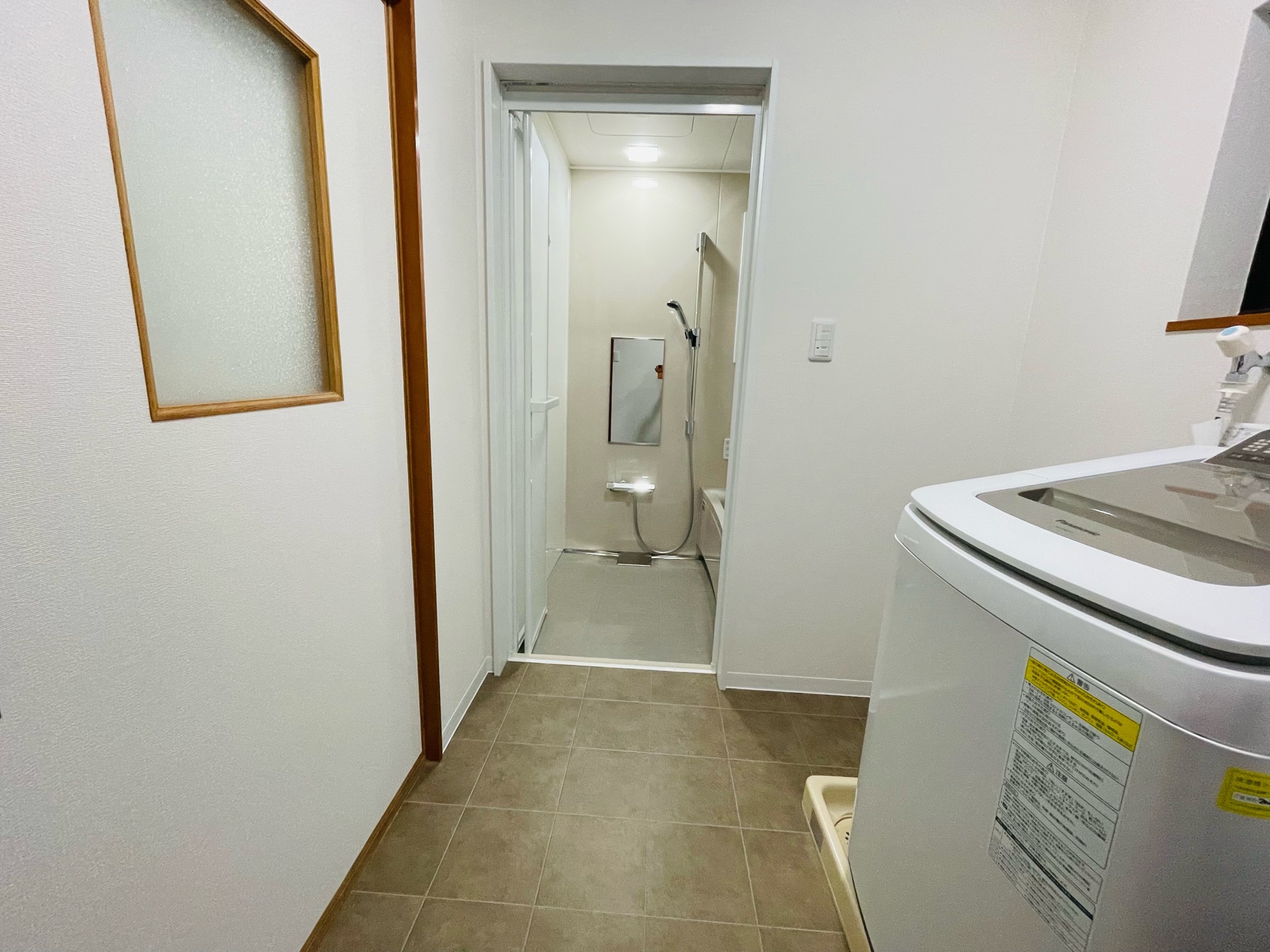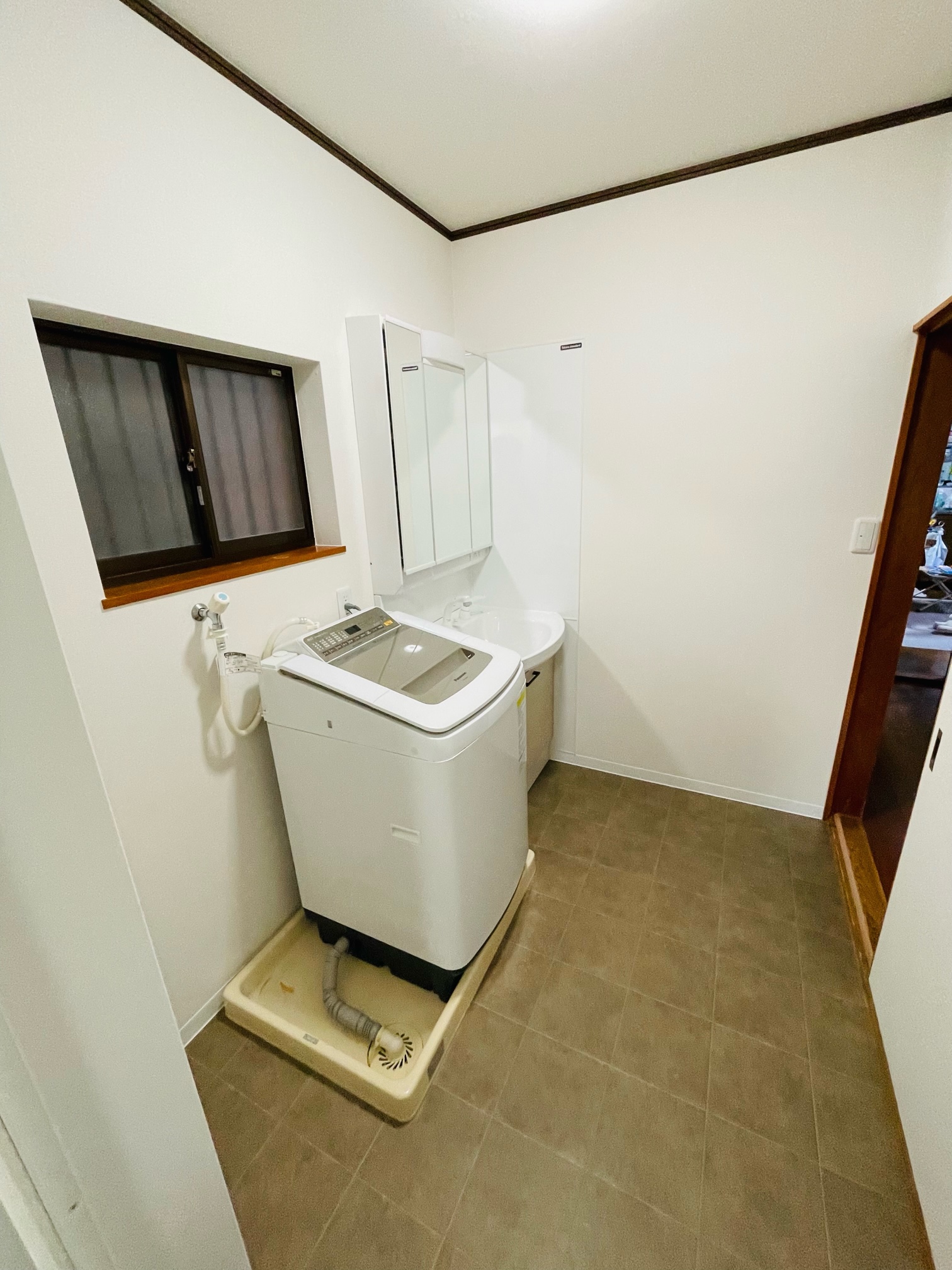 洗面化粧台も取替えて、洗面脱衣室のクロスを貼替ることで、明るくてあたたかい快適な水まわり空間へと一新。