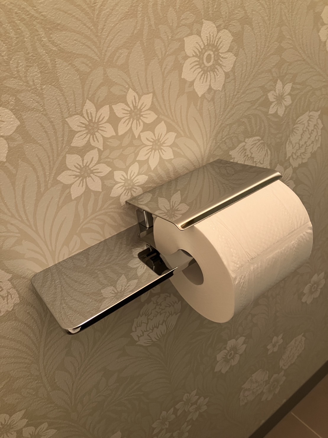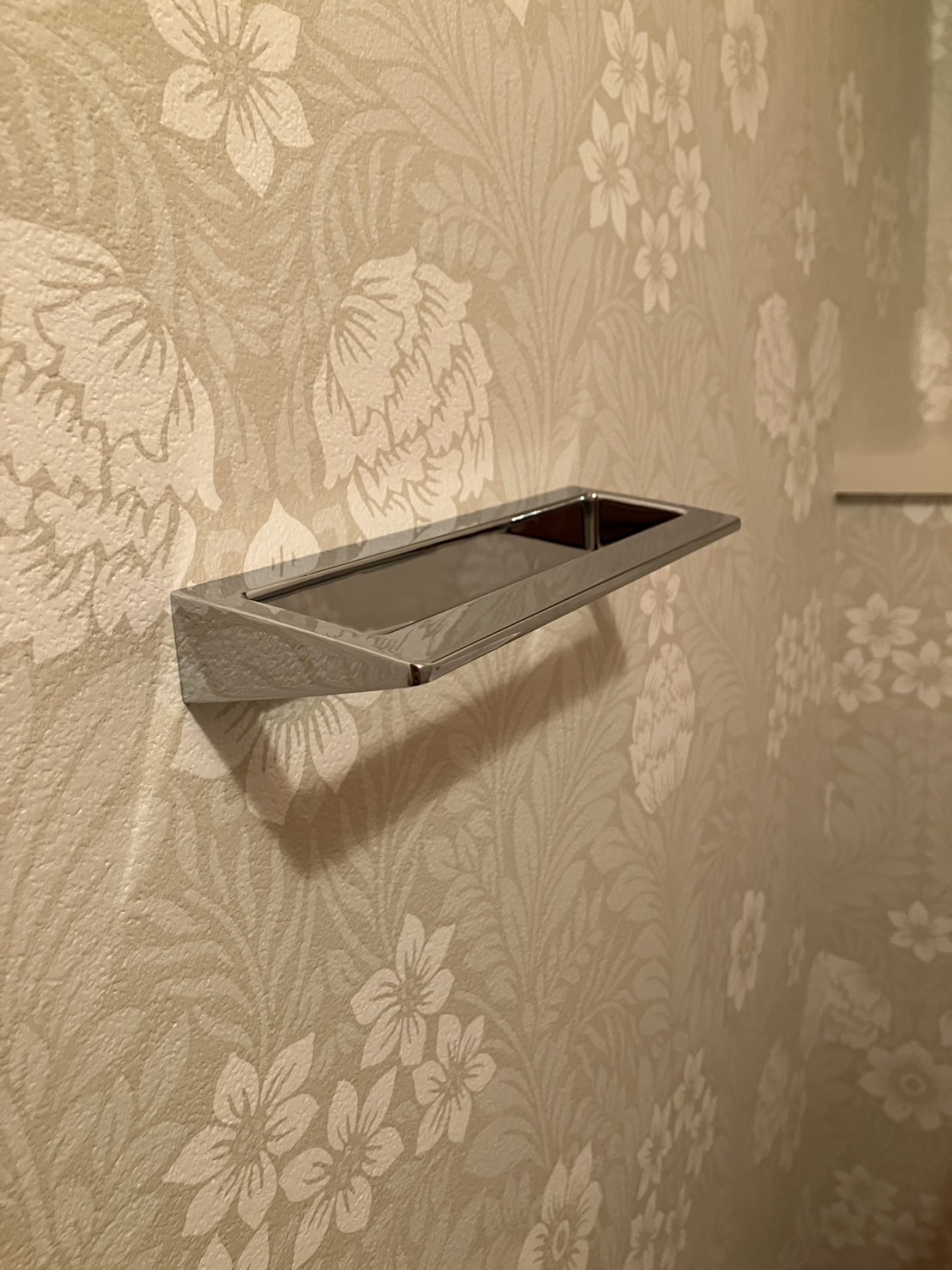 スマホ等の小物置き付きトイレットペーパーホルダー・タオル掛けは、KAWAJUN(カワジュン)製のメタリック商品を採用。