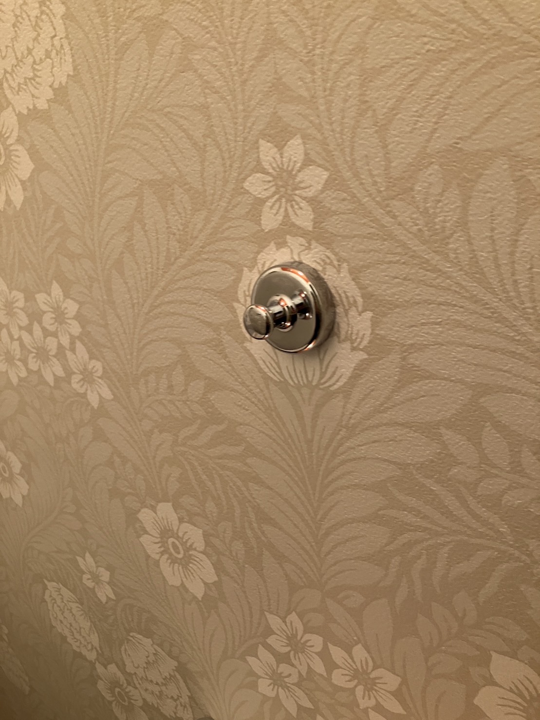 グレーを基調としたクッションフロアに、壁付けの照明に合わせた柄物の壁クロスを選定。