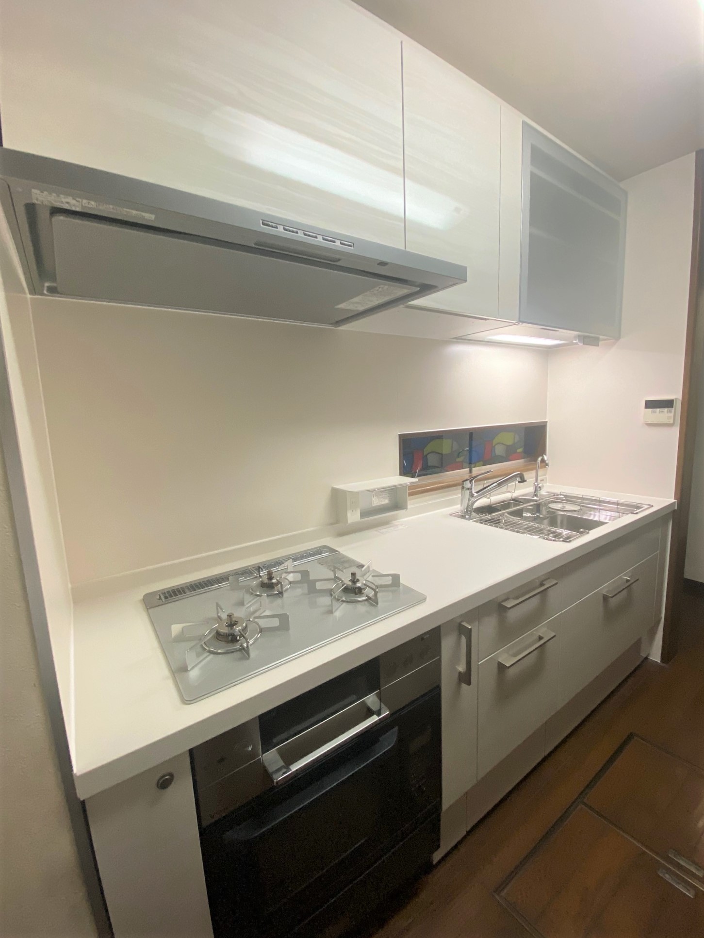 キッチンは、6年前にお取替えしたばかりのビルトインコンロとガスオーブンはそのままお使いいただき、システムキッチンだけを一新。