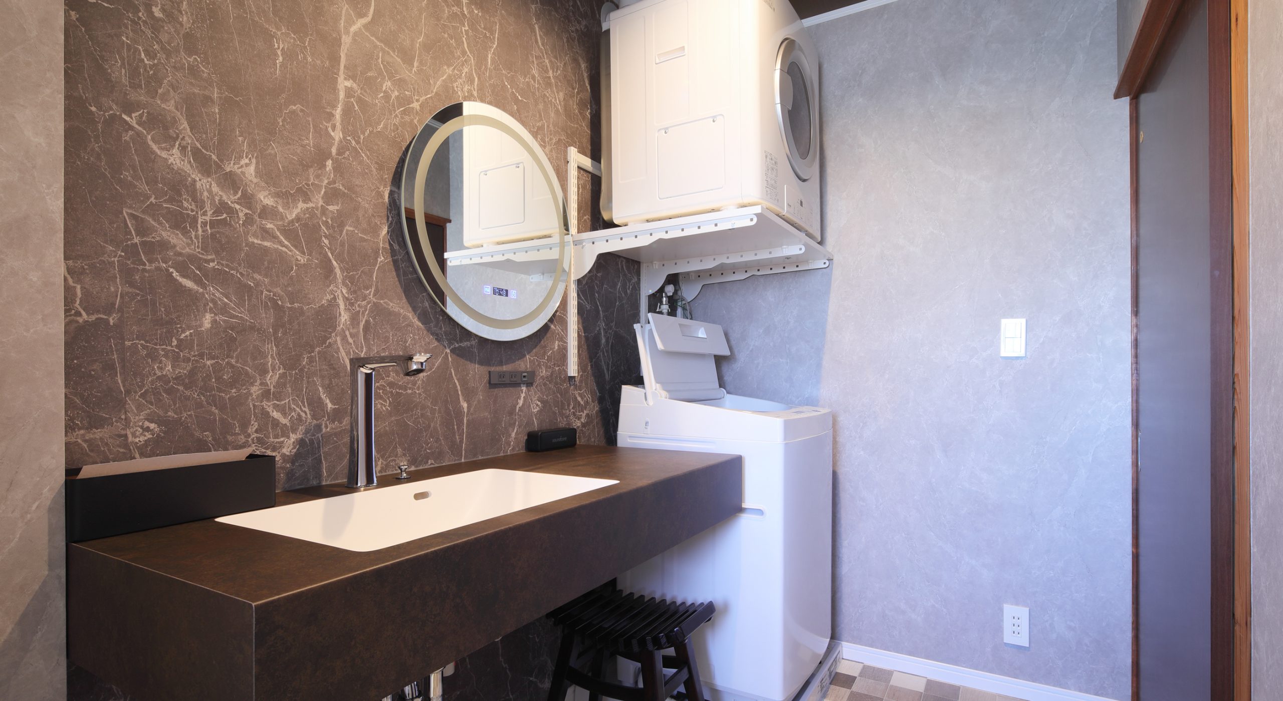 手洗いの横には、ライト付きミラーを取付けてメイクスペースも確保。