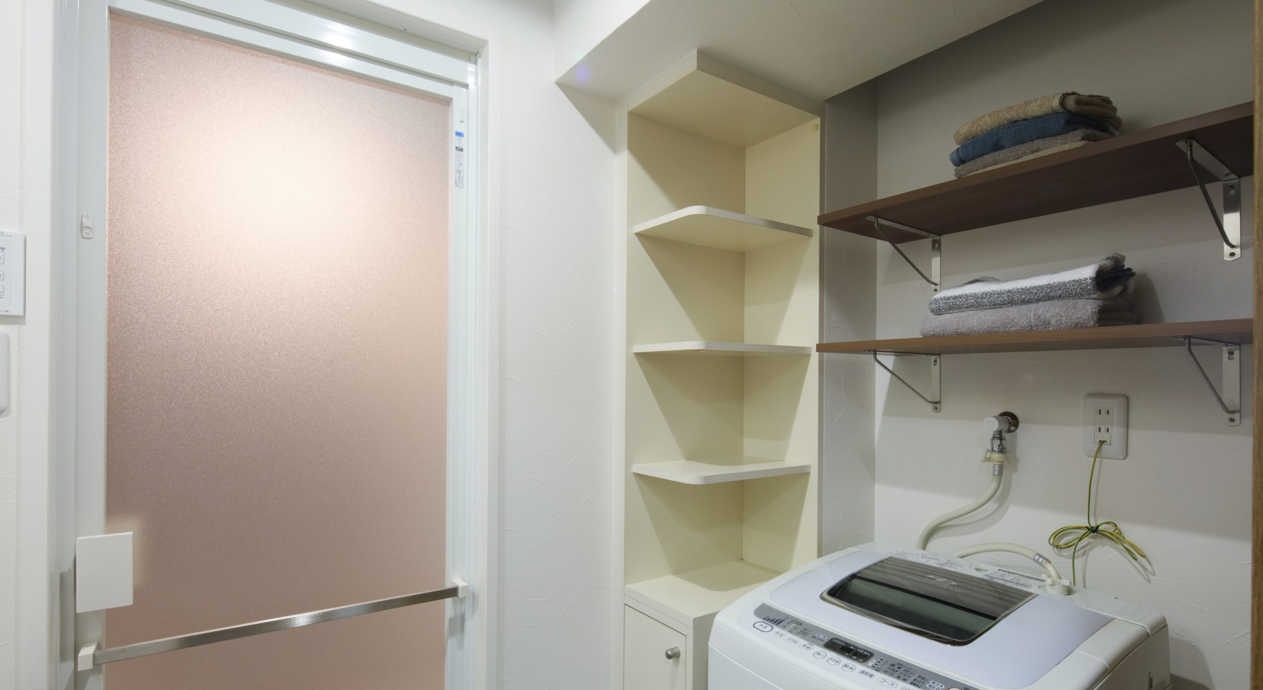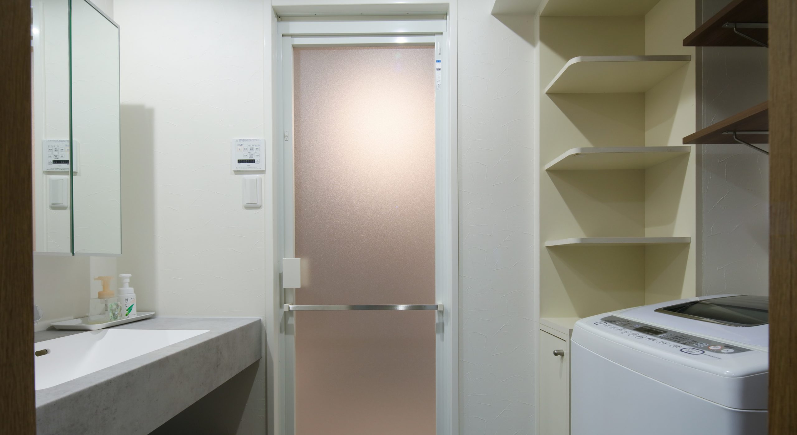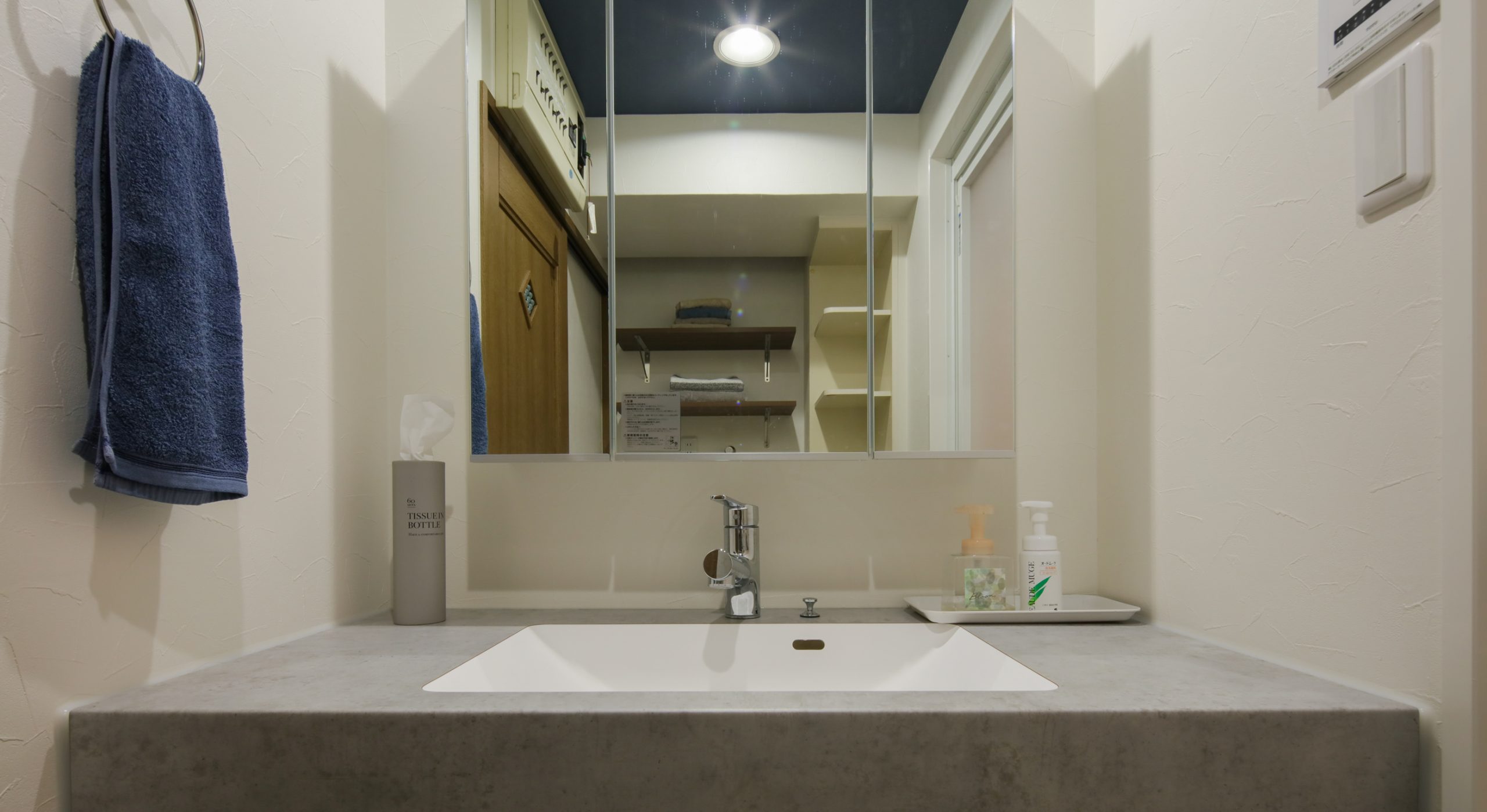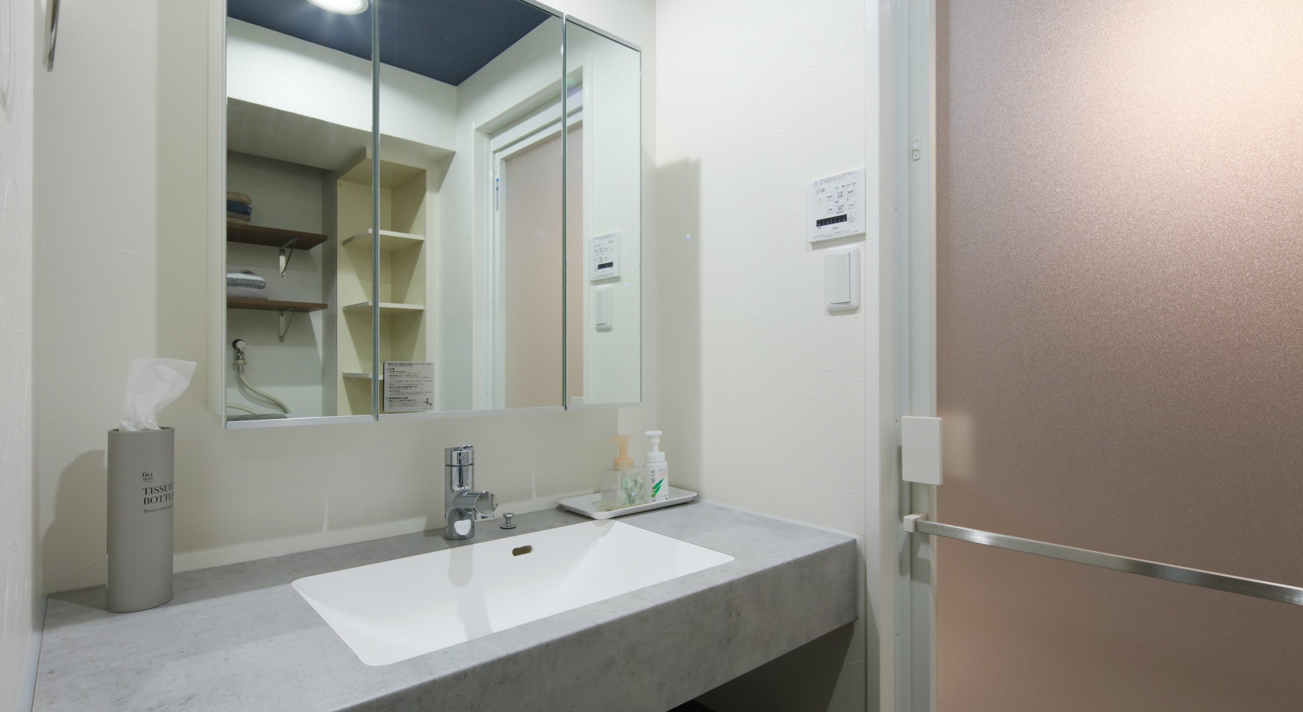 洗面台まわりの収納力を確保するため、壁面にオープンな収納棚を取付けて見せる収納に。