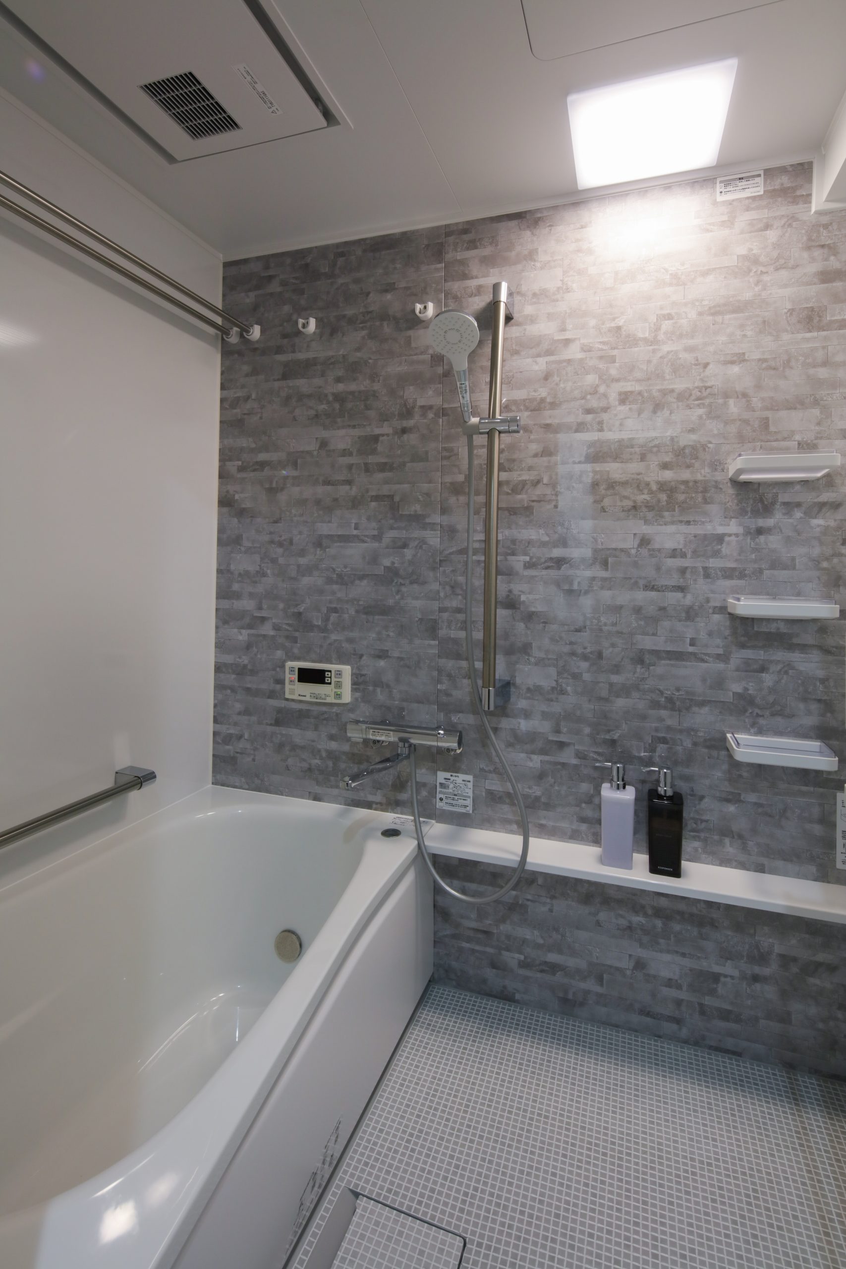 カウンターカラーとクッションフロアは、浴室のアクセントパネルに合わせグレー系に。